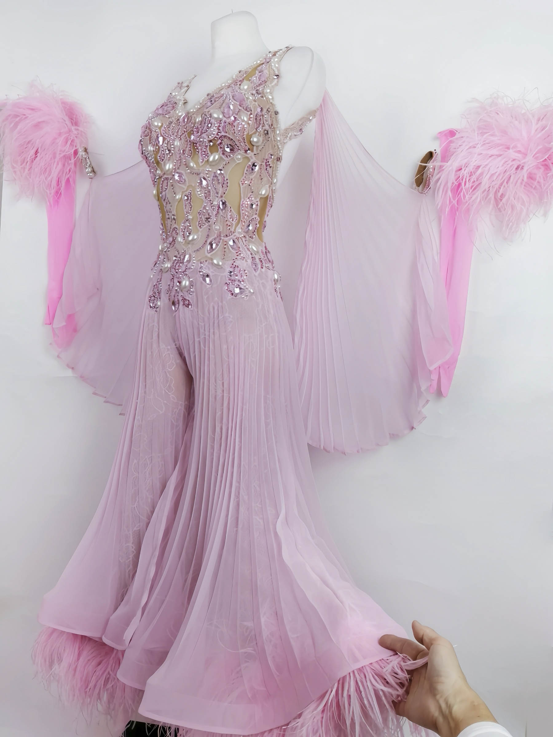 プロフェッショナル欧州選手権ブロンズメダリスト、ジャーマンオープンファイナリストなどのタイトルを持つ超素晴らしいロシアのスタンダードダンサー、エリーナ・ココトワ選手のためにロシアのフィネリ・クチュールが制作した、プリーツ、レース、オーストリッチの羽を組み合わせたスタイリッシュなパンツスタイルが大変ユニークで絶対に目が離せない超美しいピンクのスタンダードドレスです。
