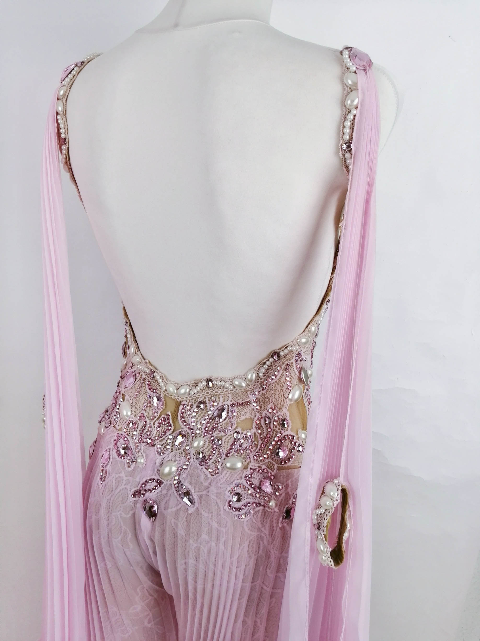 ノースリーブで背中は開いたデザインで、ボディ部分はベージュメッシュの上に縦のラインを出すように美しくレースモチーフの装飾があり、円形や楕円形などの立体的なパール、ピンク系の大小のスワロフスキの石などを使って豪華に美しく装飾されています。
