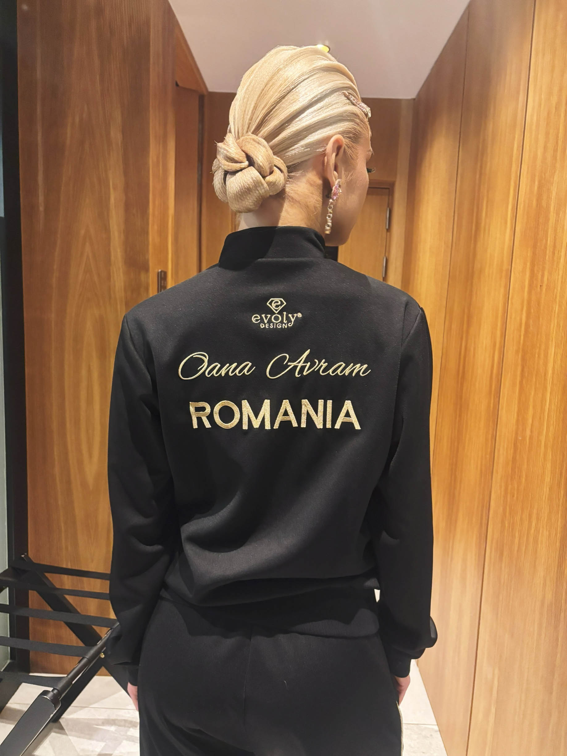 TK-ABF8 ルーマニアのEvoly Design制作!背中のゴールドの刺繍を完全カスタムできる競技会用にデザインされたの黒&ゴールドのトラックスーツ(上下ゼット、フルオーダー、刺繍込み)