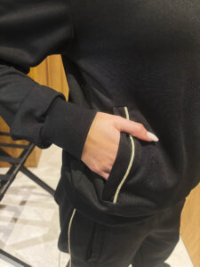 ジャケットは裾が長すぎないで、スタンドカラーの襟は大きすぎないのでメイクもきれいにキープできます。ゴールドのファスナーとゴールドのラインがマッチしていて大変スタイリッシュで、素材はしっかりとした速乾性の美しいジャージ素材。非常に高品質で扱いやすい素材を使っていてまったくしわにもならずストレッチもたっぷりなので着心地も抜群です。