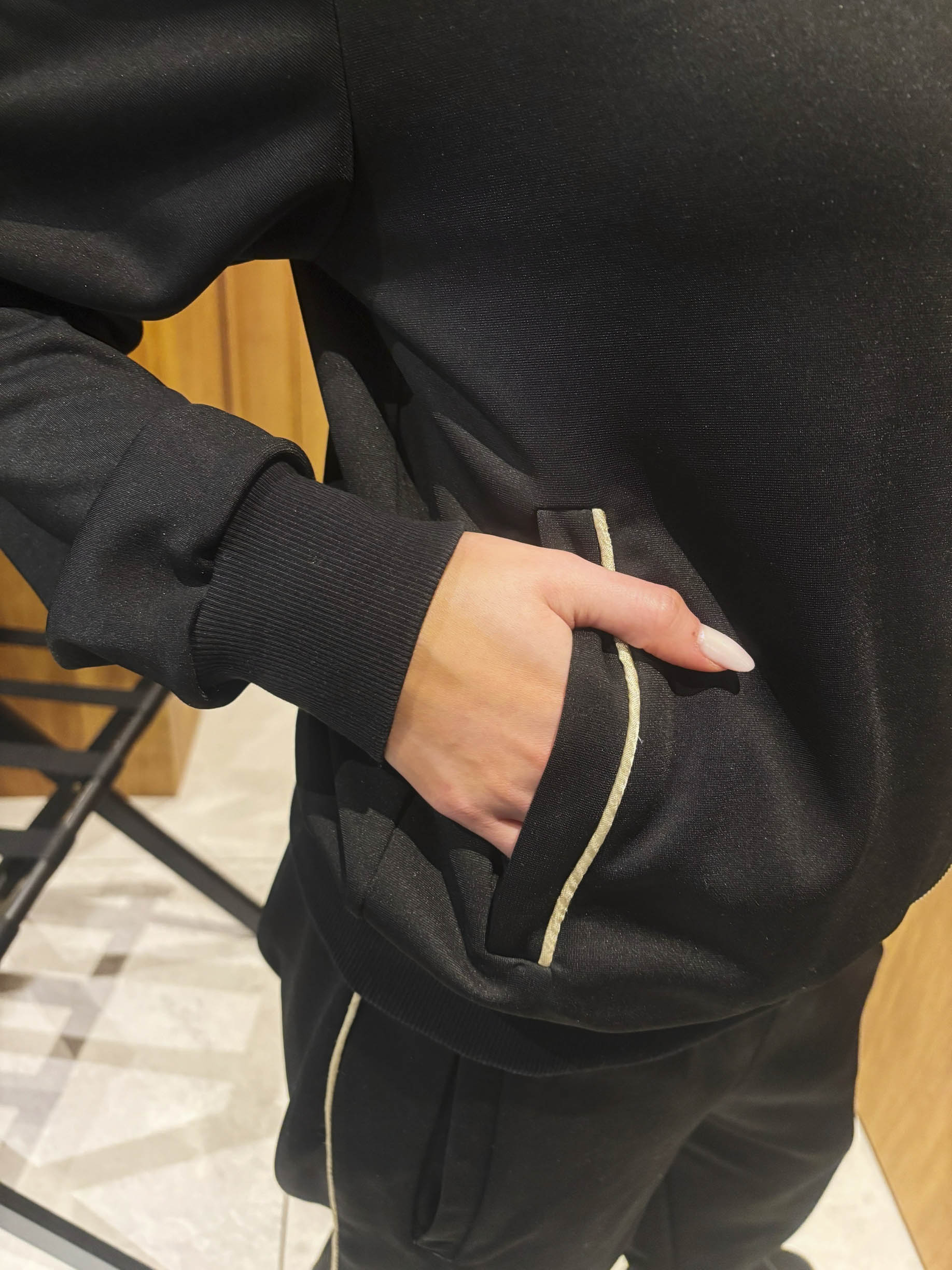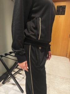 スタンドカラーでゴールドのファスナーが大変美しいジャケット、ウェストがゴムになったパンツは裾は絞られていないデザインで、ジャケットのポケット部分とパンツのサイドにゴールドのラインが入っています。
