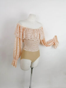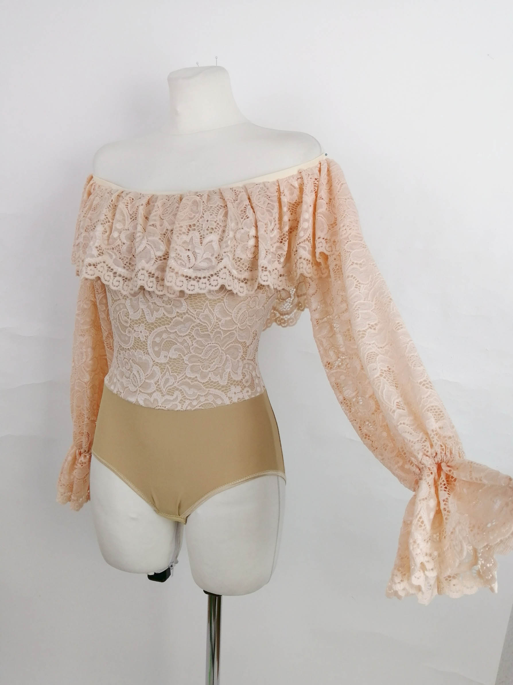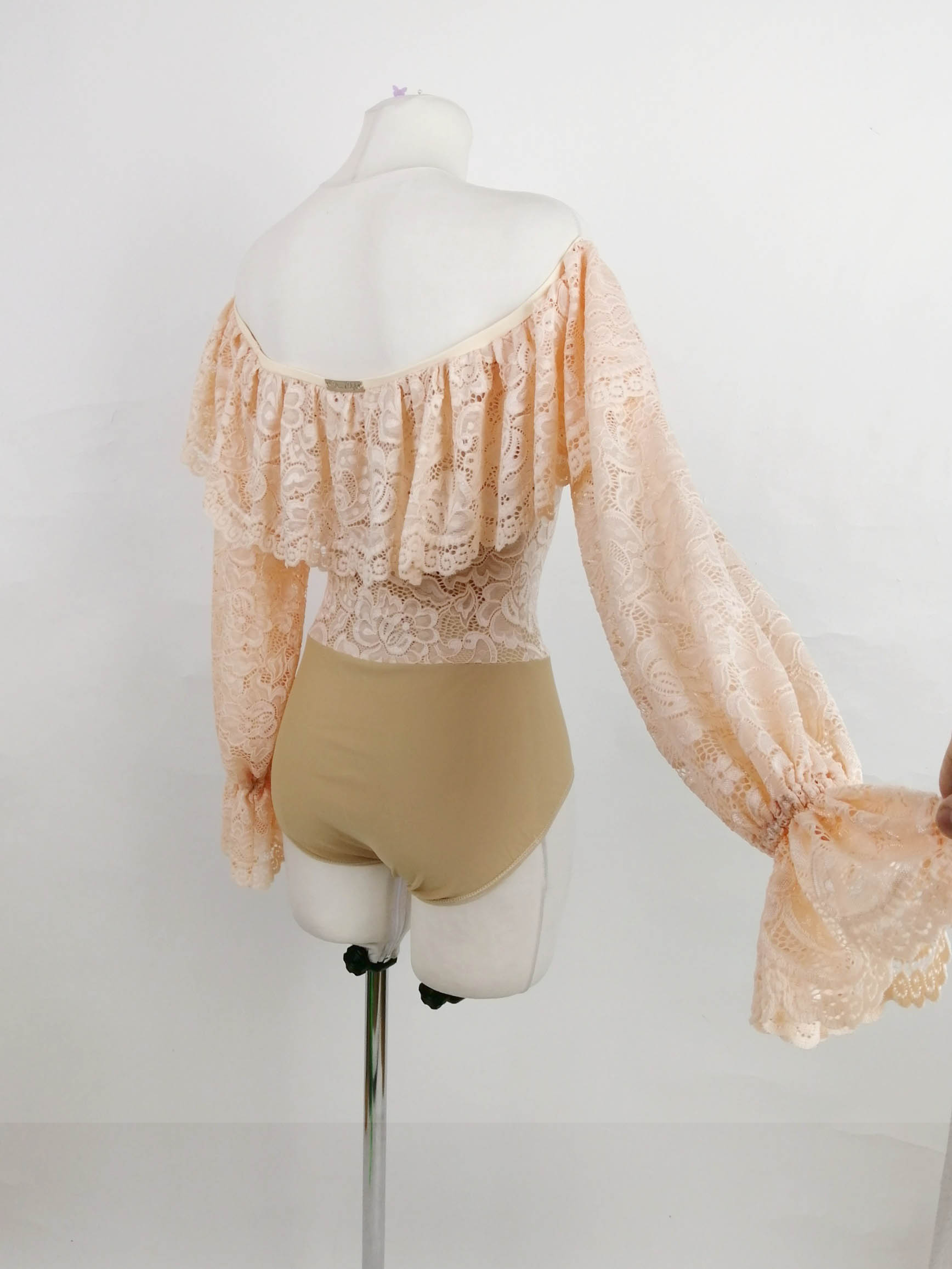 ベージュのライクラの上に、美しいシャンパンピンク色の花柄が美しいストレッチレースを重ねて作られた、総レースが超ゴージャスで美しいレオタード。オフショルダーでボリュームたっぷりのデコルテラインのフリルが非常に美しいデザインで、ホールドするとフリルが非常に美しく広がります。