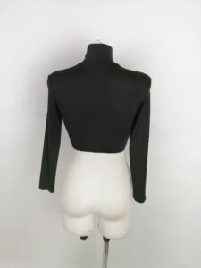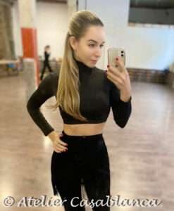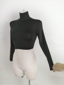 ウクライナのチャンピオンのタイトルを持ち、2025年のロンドンインターではセミファイナルに入賞したトップラテンダンサー、ヴィクトリア・マイスター選手所有のスタイリッシュで超かっこいいハイネック、長袖の短めのカットソーです。