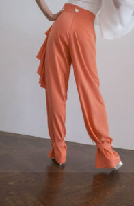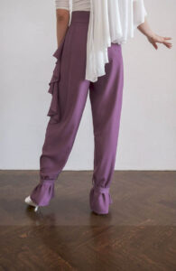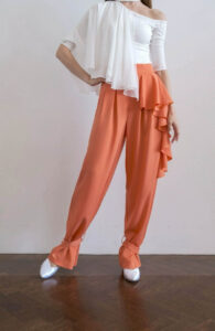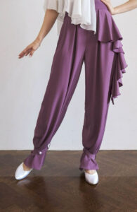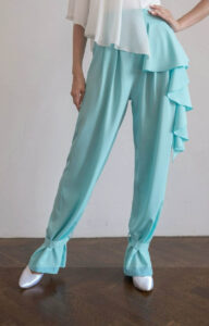 ロシアの超素晴らしいラグジュアリーダンスウェアブランドで、管理人自身も多くのウェアをオーダーしている超絶おすすめの「プラクシス」制作の、ウェストから左サイドにかけてのフリルのデザインが超美しい、最高にスタイルよく見えて着心地最高のワイドパンツです。