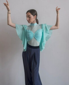 スタンドカラーで背中が丸く開いたデザイン。ストライプのメッシュを使っているので大変スタイルよく見え、体のラインがとても美しく見える視覚効果があります。