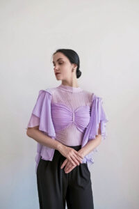 バストラインスタイリッシュかつ上品にドレープを寄せた無地のライラックの布を使っており、パールの装飾がとてもエレガントです。メッシュの透け感は非常に少ないので、バストラインだけが強調されるデザインではなく、とても上品で落ち着いた印象のウェアです。