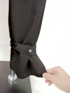 裾にループとストラップがあり、ストラップはスナップボタンで開閉する構造になっており、取り外し可能で裾絞りタイプに変更することもできます。