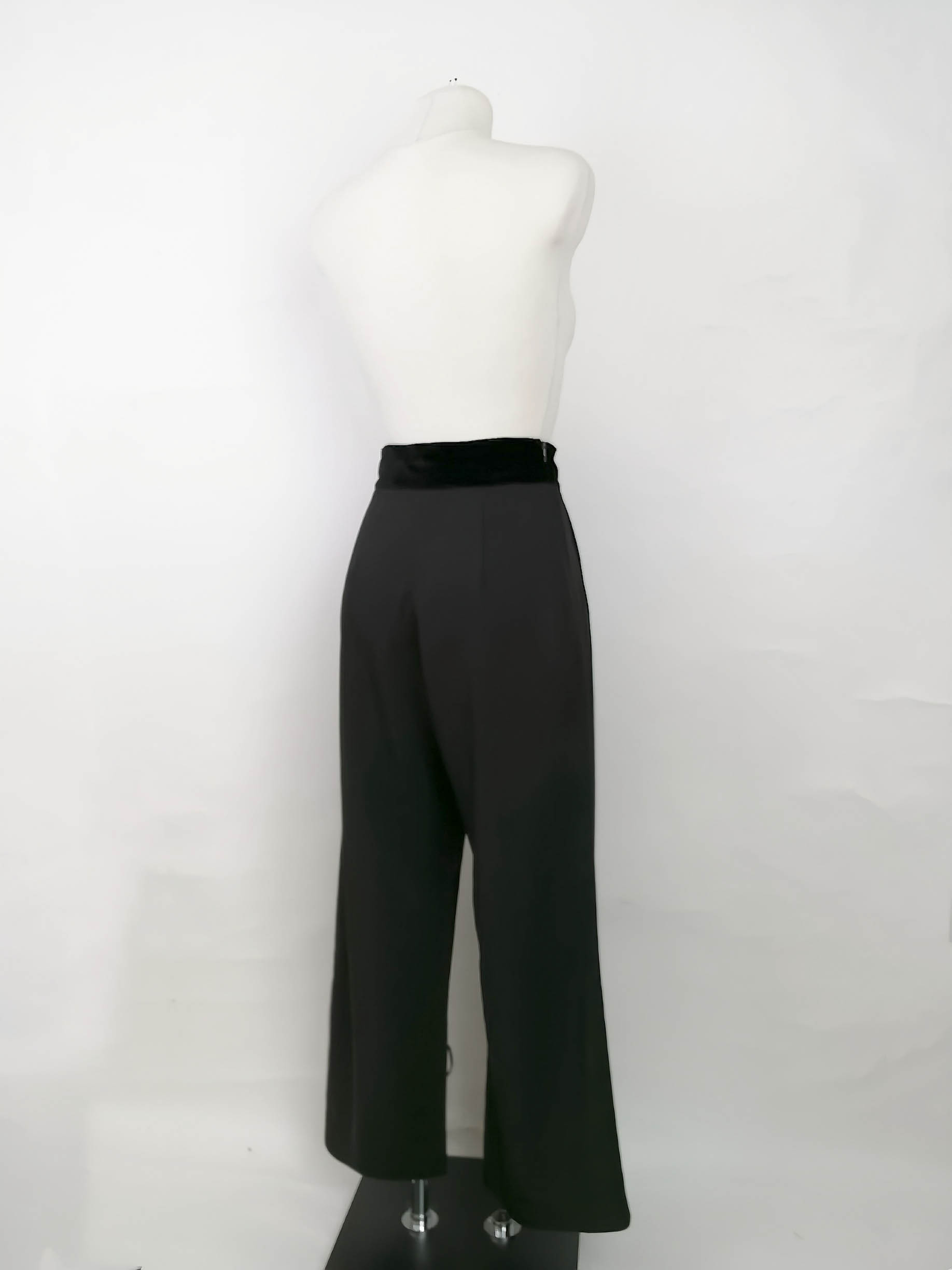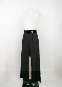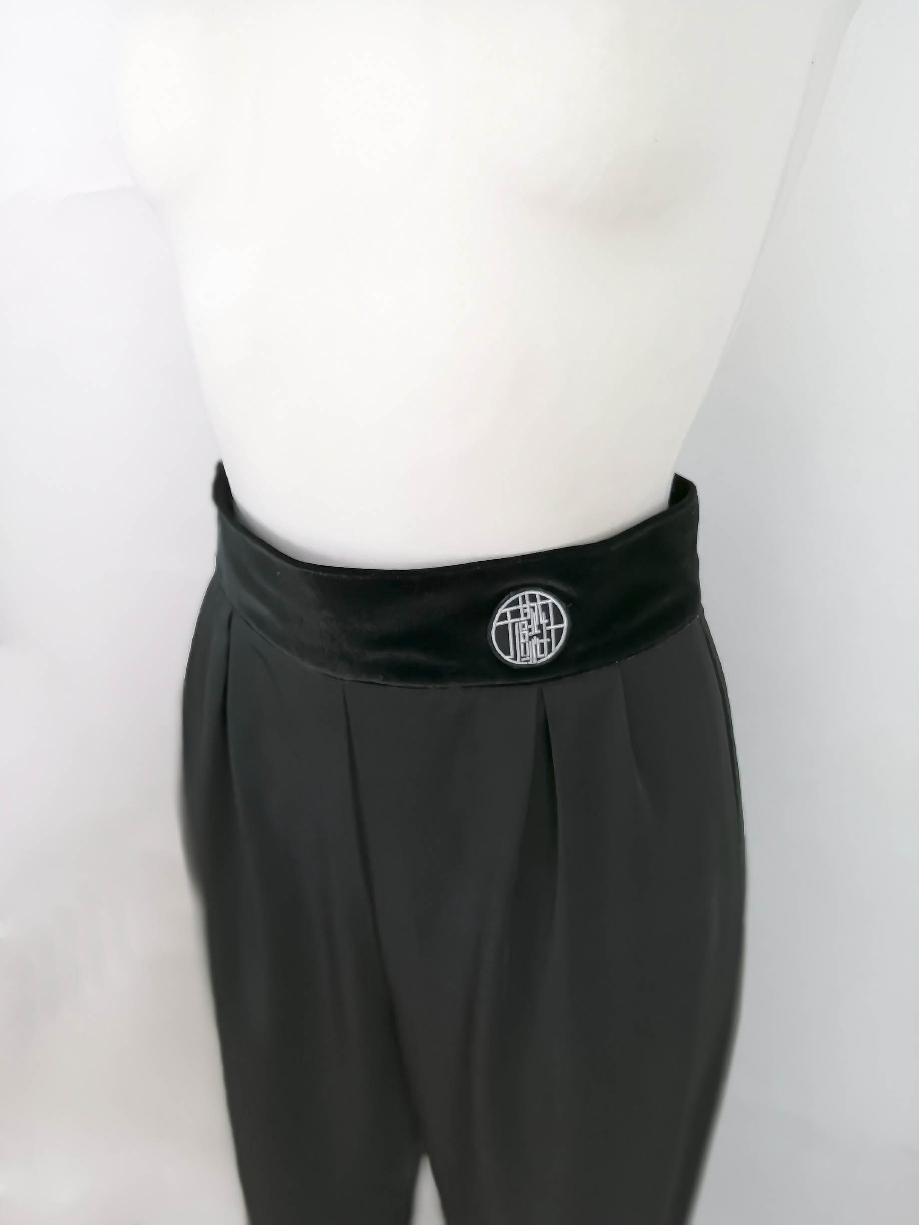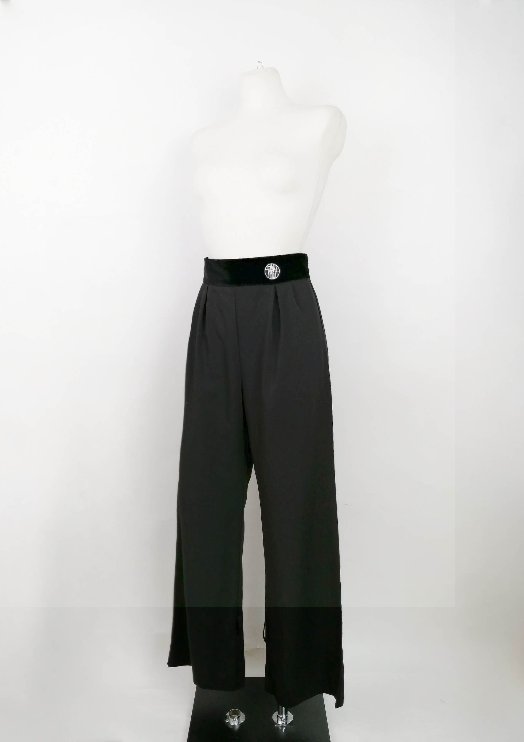 エストニアのラグジュアリーダンスウェアブランド、「ノーブレス」の裾絞りスタイルにもなる黒のパンツです。スタンダード用にもラテン用にもできるストレートなラインで、ウェストラインはベルベット素材になっていてノーブレスのロゴが入っています。サイドファスナーで、おなか回りがぼこっとせずにとてもきれいに見えるラインのウェアです。
