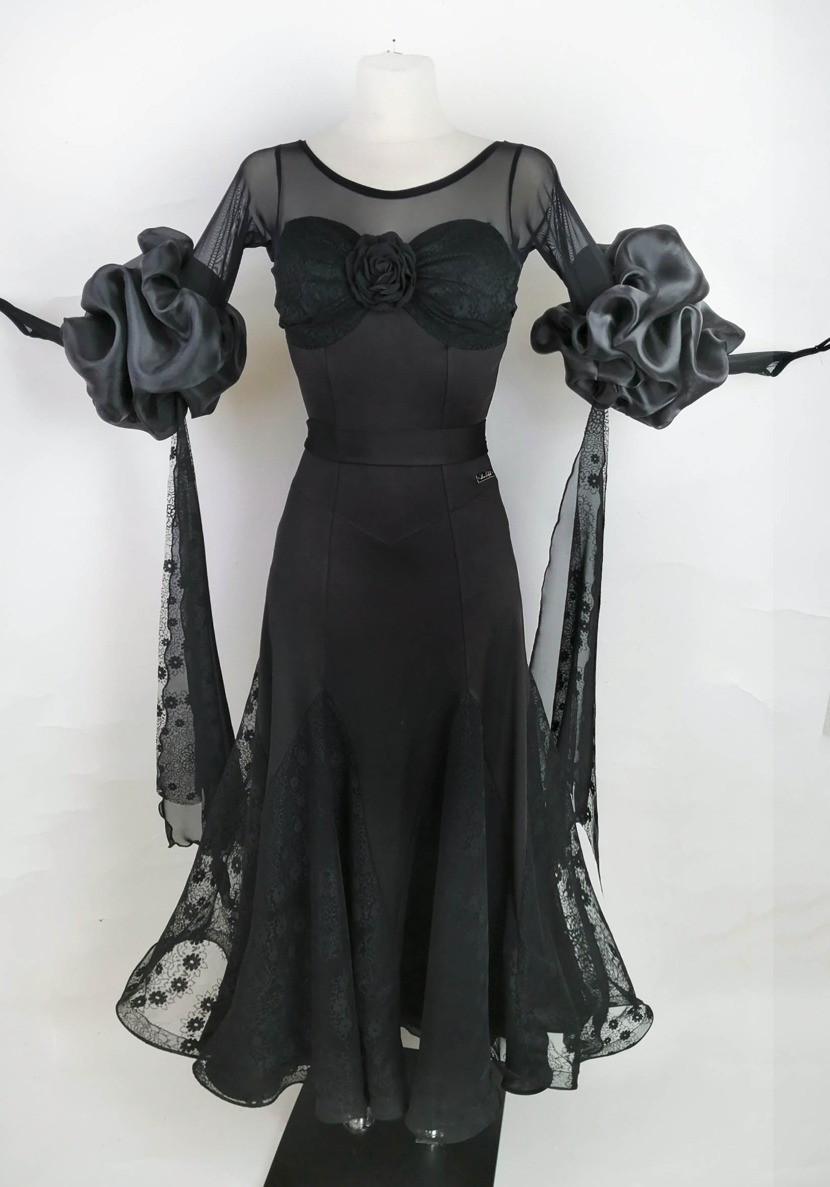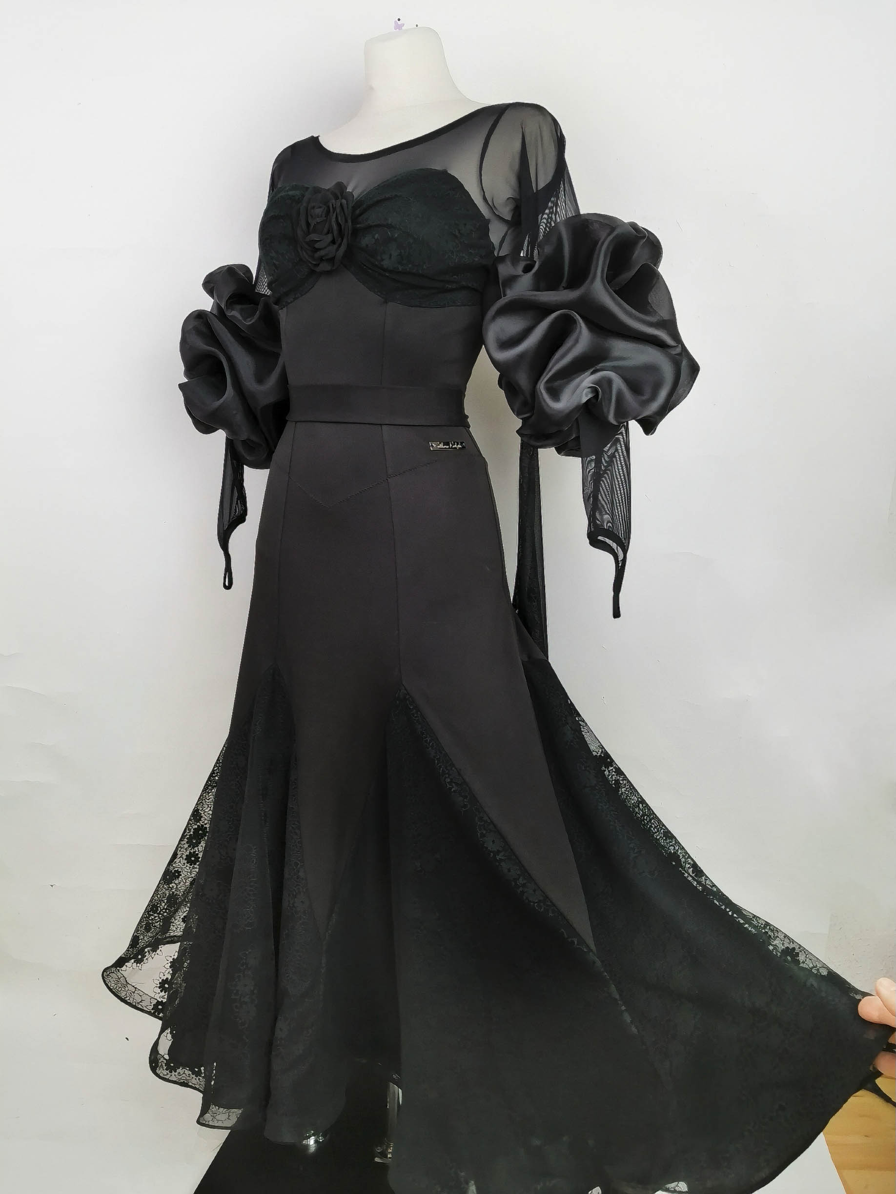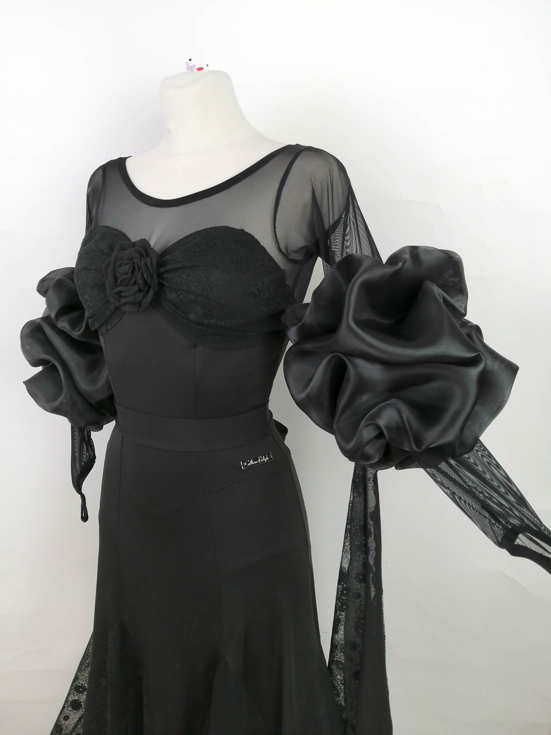 管理人超絶お勧め!管理人自身もたくさんのウェアをオーダーしてヘビロテしまくっている超素晴らしいウクライナのラグジュアリーブランド、「スヴェトラーナ・パブリッシュ」制作の、立体的な袖の飾りのデザインとレースを使ったスカートとフロートのデザインが超美しい黒の長袖の石なしのスタンダードドレスです。未使用の新品。
