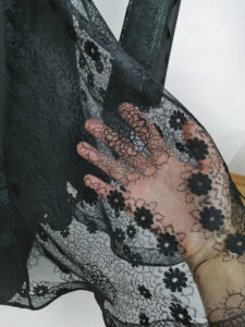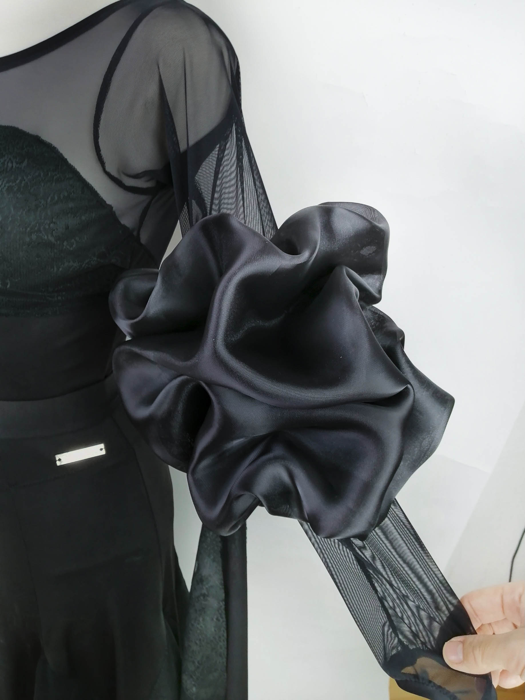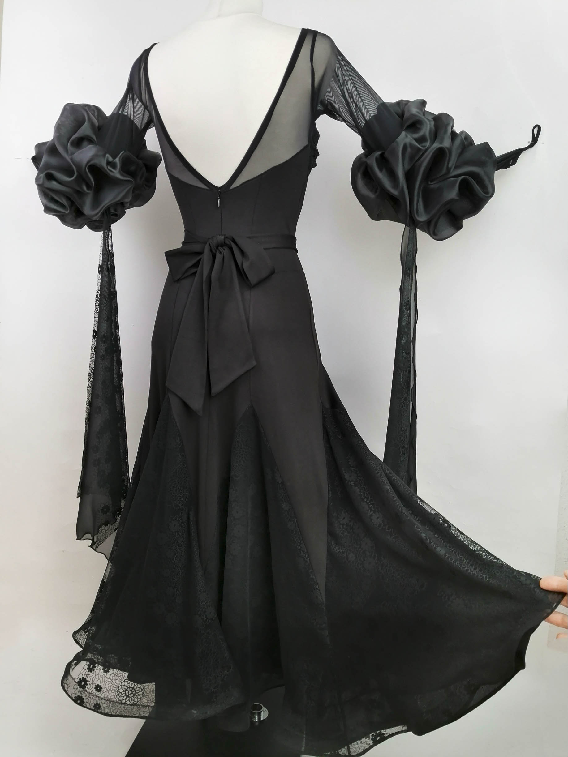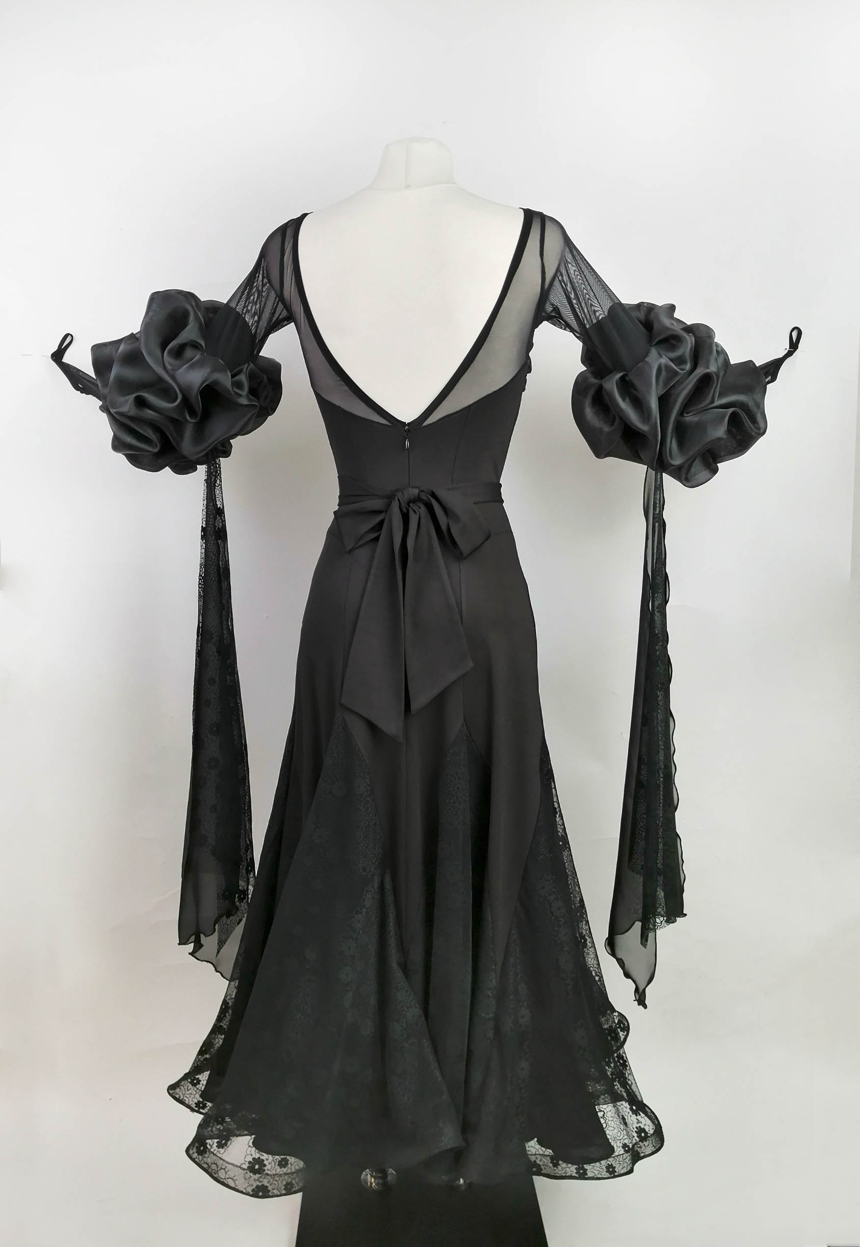 管理人超絶お勧め!管理人自身もたくさんのウェアをオーダーしてヘビロテしまくっている超素晴らしいウクライナのラグジュアリーブランド、「スヴェトラーナ・パブリッシュ」制作の、立体的な袖の飾りのデザインとレースを使ったスカートとフロートのデザインが超美しい黒の長袖の石なしのスタンダードドレスです。未使用の新品。