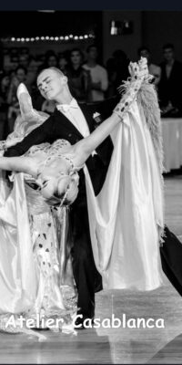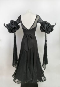 袖のしっかりとしたオーガンジー素材で制作された袖の飾りのデザインが非常に素晴らしく、ホールドした腕のラインを大きく美しく見せるので非常に人気のあるデザインです。フロートはレースとジョーゼットを両方使っており、大変美しく踊ります。スカートの裾にはいずれもホースヘアが縫い込まれていて、美しい広がりで大変きれいに踊ります。
