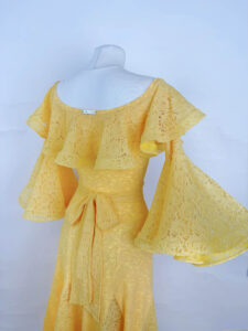 総レースで、レースに上品な光沢があり、非常にラグジュアリーで華やかなドレスです。暖かみのあるイエローは日本人の肌の色に大変よく似合う色で、肌がとても生き生きときれいに見えます。