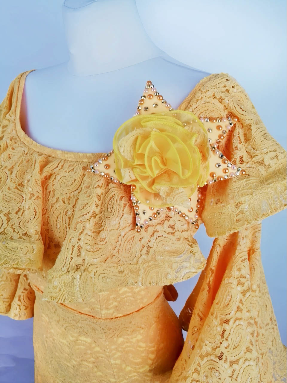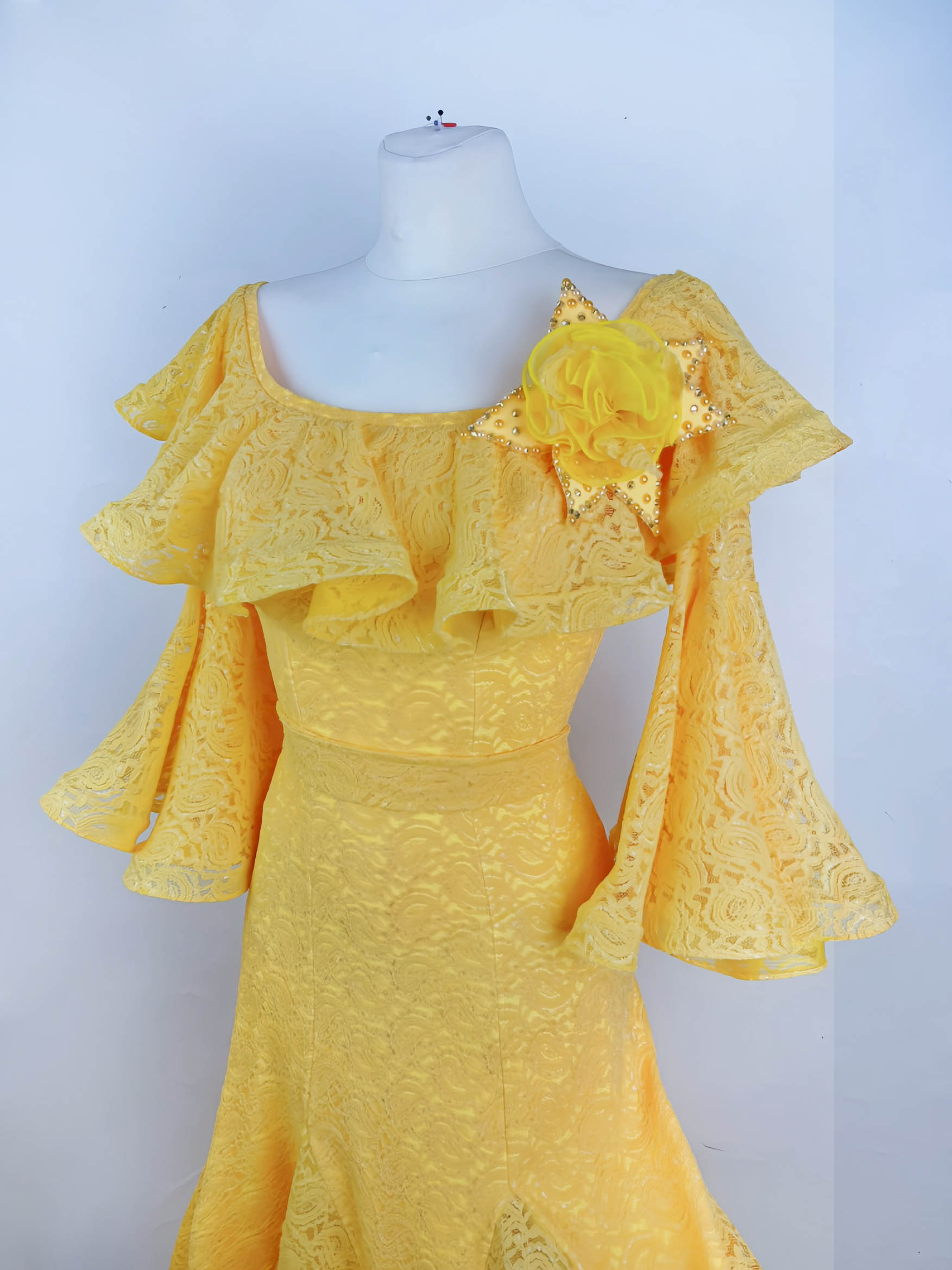 ウクライナのラグジュアリーダンスドレスブランドで、管理人が最高に信頼しており、管理人自身も大ファンの「スヴェトラーナ・パブリッシュ」制作の鮮やかで暖かみのあるイエローのレースが超エレガントで美しいスタンダード用ワンピースです。