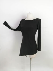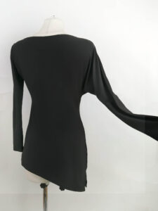 ボートネックで背中は開かないデザインで、ウェストがシェイプされたアシンメトリーなデザイン。左側の袖はドルーまんスリーブになっていて、一見シンプルですが着用すると大変おしゃれな美しいウェアです。