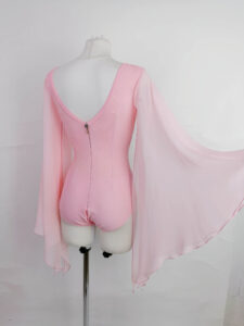 前後がVカットに開いた、デコルテや背中が大変美しく見えるデザインで、ジョーゼットの大きなフロートが袖の役割を果たしてとてもよく踊ります。