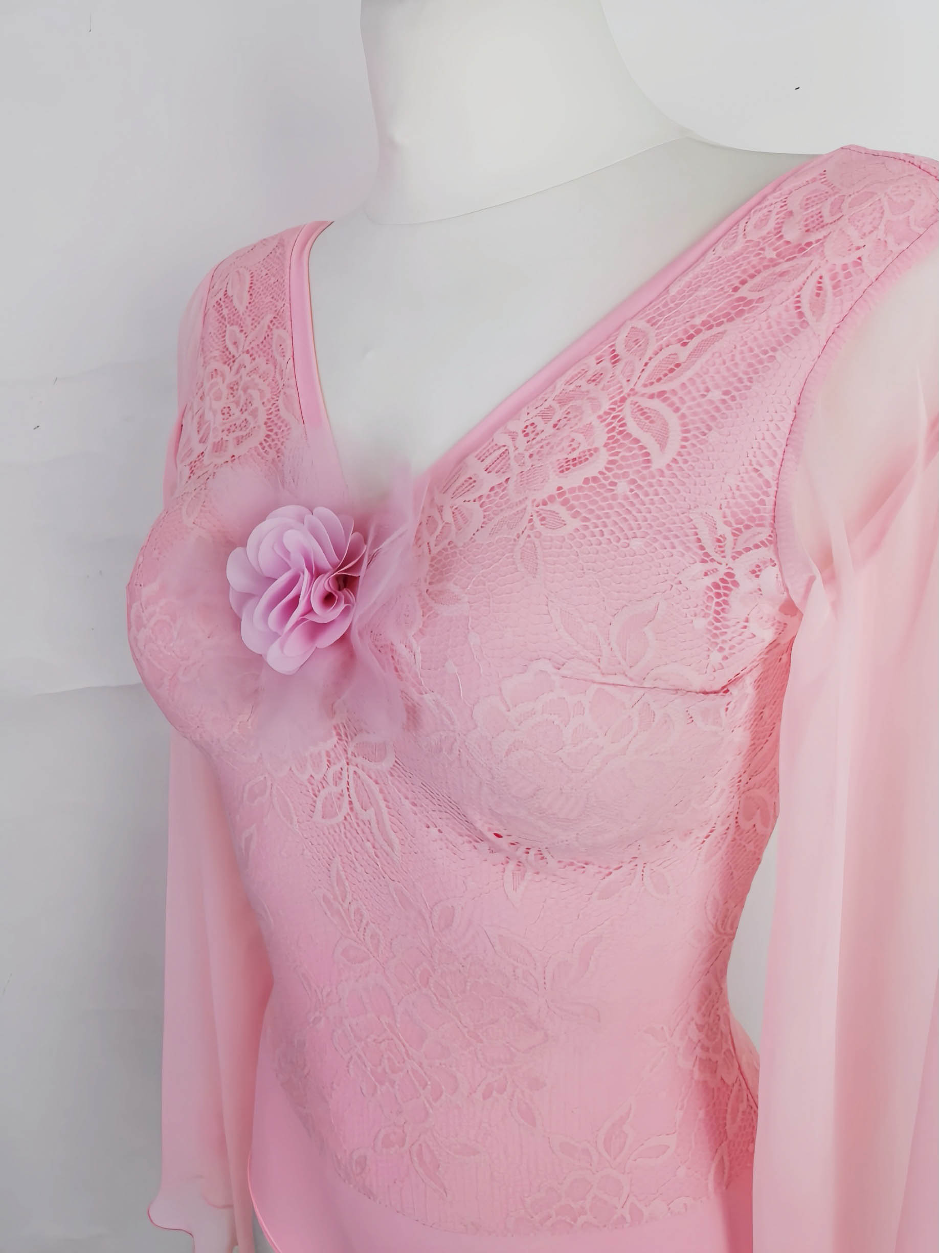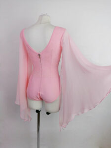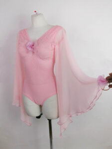 ボディ部分はピンクのストレッチライクラの上にピンクのストレッチレースを重ねており、透けることはなくレースの柄が大変美しく浮き上がる、非常にエレガントで美しくラグジュアリーなデザインのウェアです。