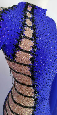 SK-JBE5ロシアの「ナタリー・アート」がロシア選手のために制作した石びっしりの超スタイルよく見えるロイヤルブルー&ヴィンテージローズ色の石びっしりのスタンダードドレス(大き目9号―11号)