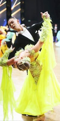 SK-BCE6 放射状に広がる石の装飾が超スタイル良く見せるオーストリッチづかいの黒&イエローのスタンダードドレス(9号)