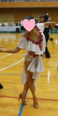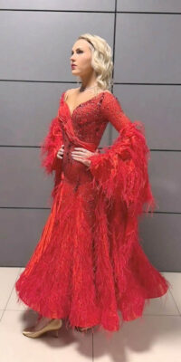 SK-DBF4 ロシア「アルテラ」がラトビアの世界選手権代表選手のために制作した、立体的なオーナメントと羽びっしりのスカートが超豪華で美しい白のスタンダードドレス(9号)