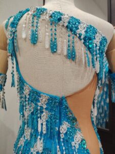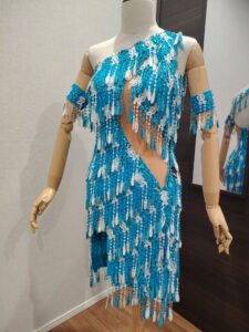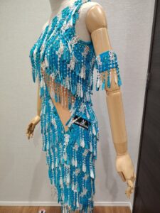 LK-BBF1「アブラハム・マルティネス」制作のレースのフリンジが大変よく踊る石びっしりのターコイズブルー&白のアシンメトリーなラテンドレス(9号または11号)