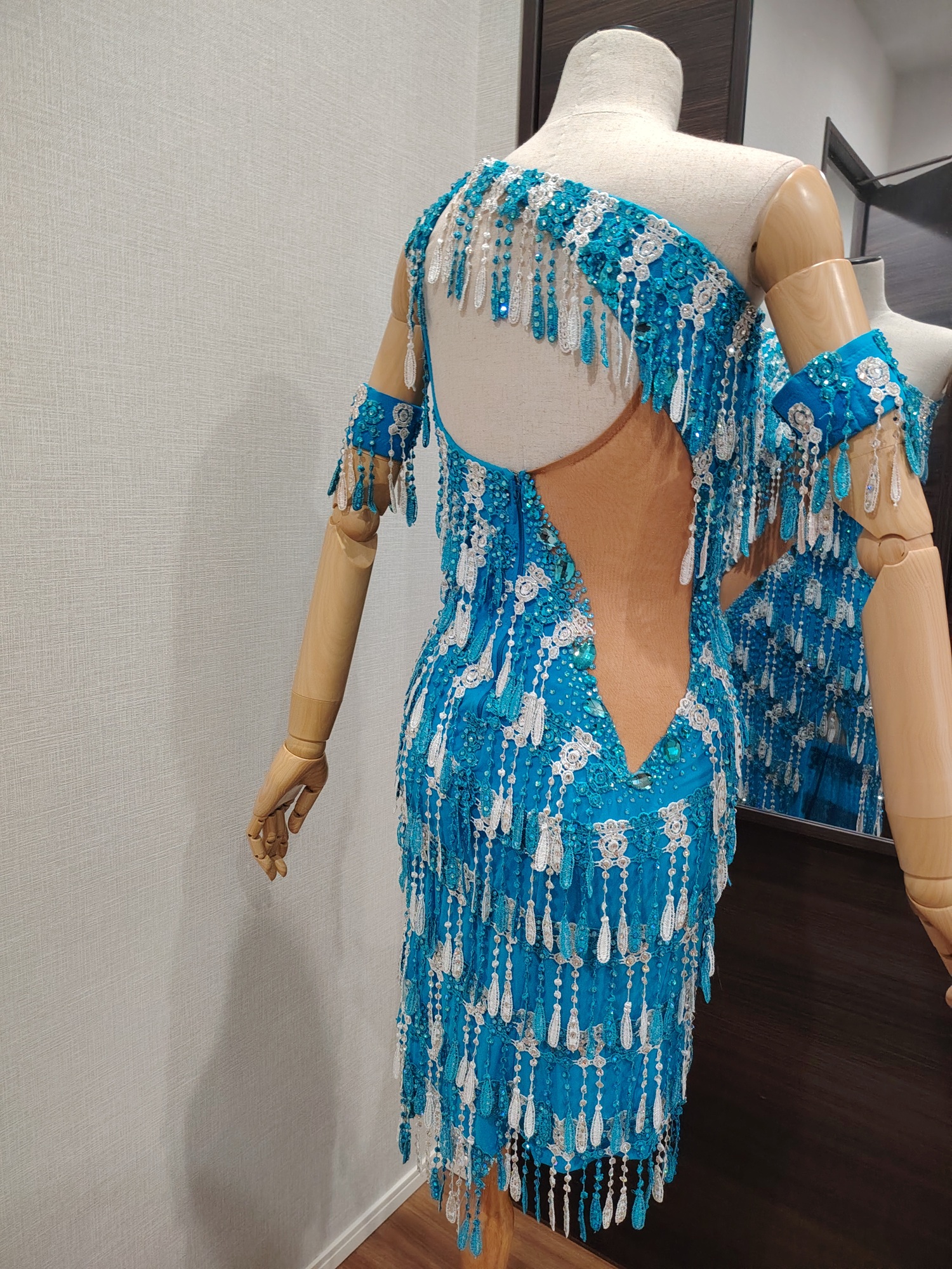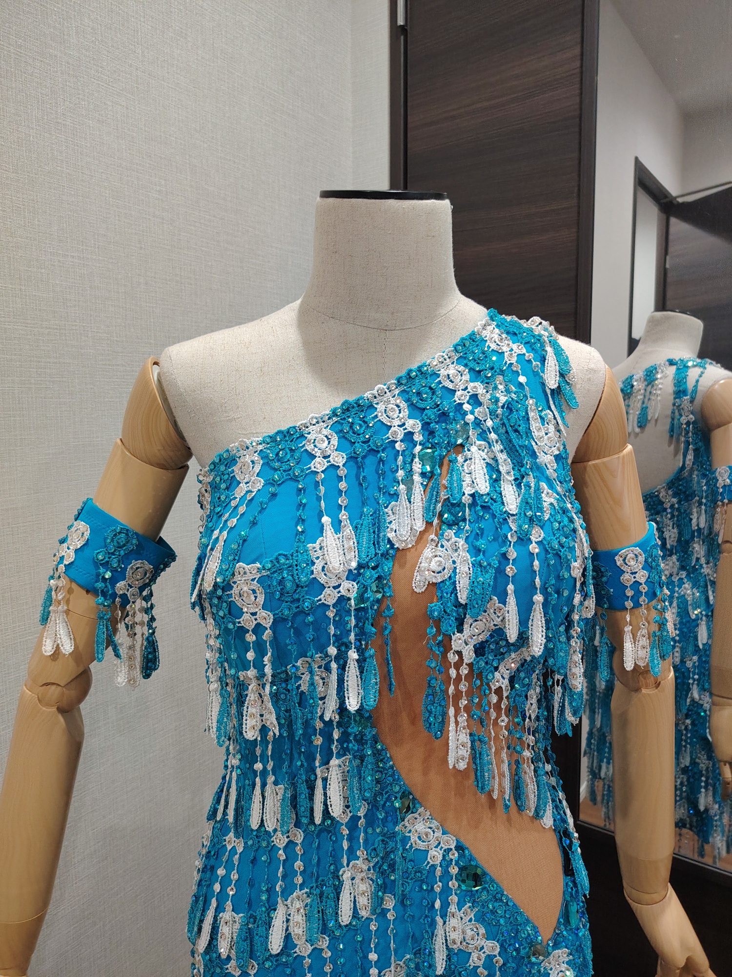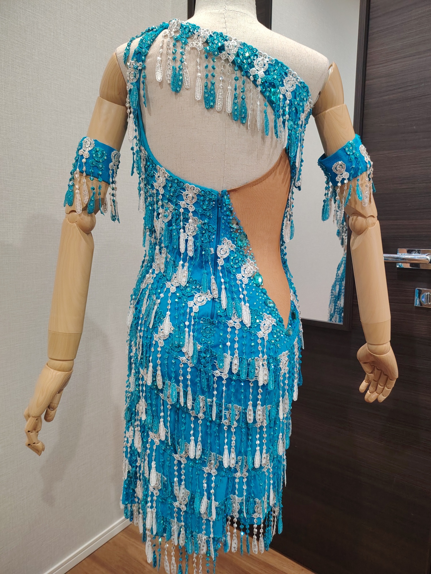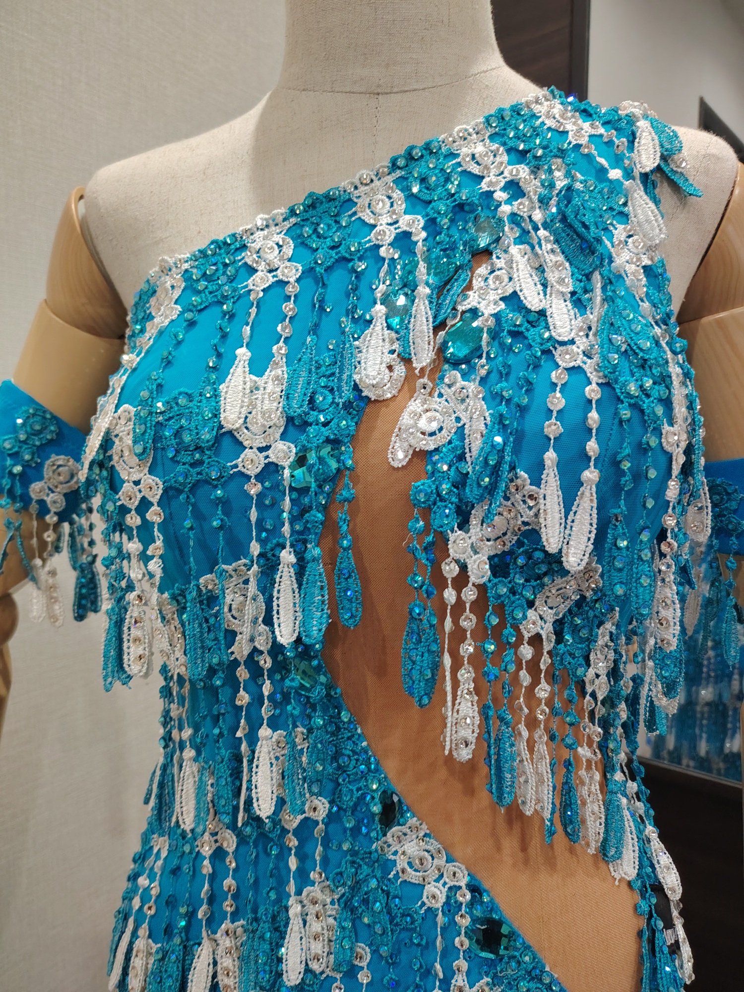 LK-BBF1「アブラハム・マルティネス」制作のレースのフリンジが大変よく踊る石びっしりのターコイズブルー&白のアシンメトリーなラテンドレス(9号または11号)