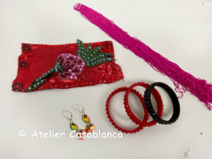 スナップボタンで留める幅広の手首用の赤のメタリックのバングルおよび赤の石びっしりの普通のバングル2本。黒のバングル1本およびピンクのフリンジの飾り、ヴィトリウムライトのスワロフスキの石が垂れ下がるピアスが付属しています。