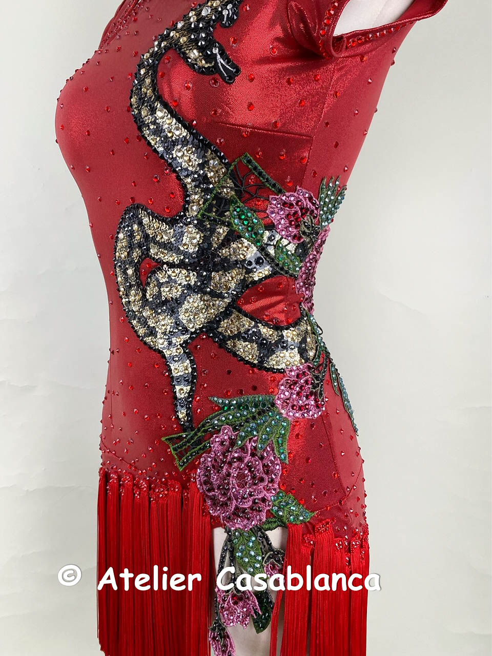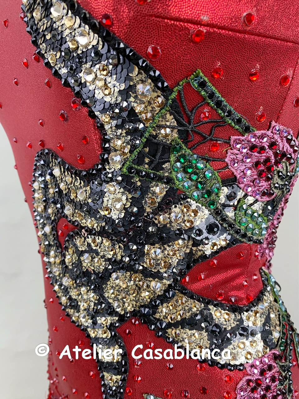 ドレス全体に赤のスワロフスキの石が貼られており、モチーフ上には黒、ゴールド、ピンク、グリーンなどのスワロフスキの石がモチーフの柄に合わせて美しく装飾されています。