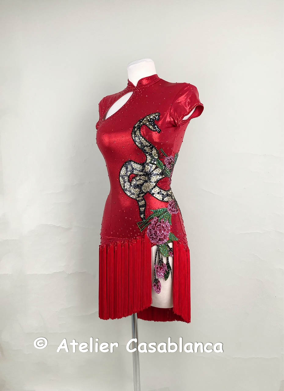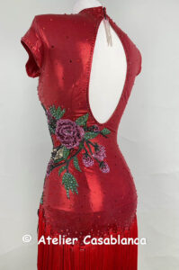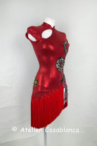 スカートはアシンメトリーなフリンジがとてもよく踊るデザインで、メタリックな赤のストレッチライクラ素材の光沢が大変美しいドレスです。