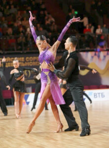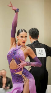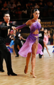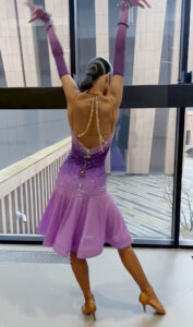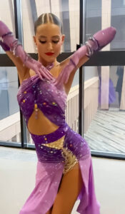 管理人超絶お勧め、管理人自身もスタンダードドレスをオーダーしている超素晴らしいロシアのブランド、「AMデザイン」制作のスカートが大変よく踊る、非常に希少でエレガントなピンク~ライラック~紫のグラデーションのフレアのラテンドレスです。