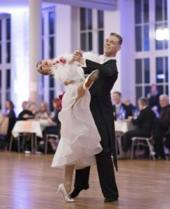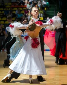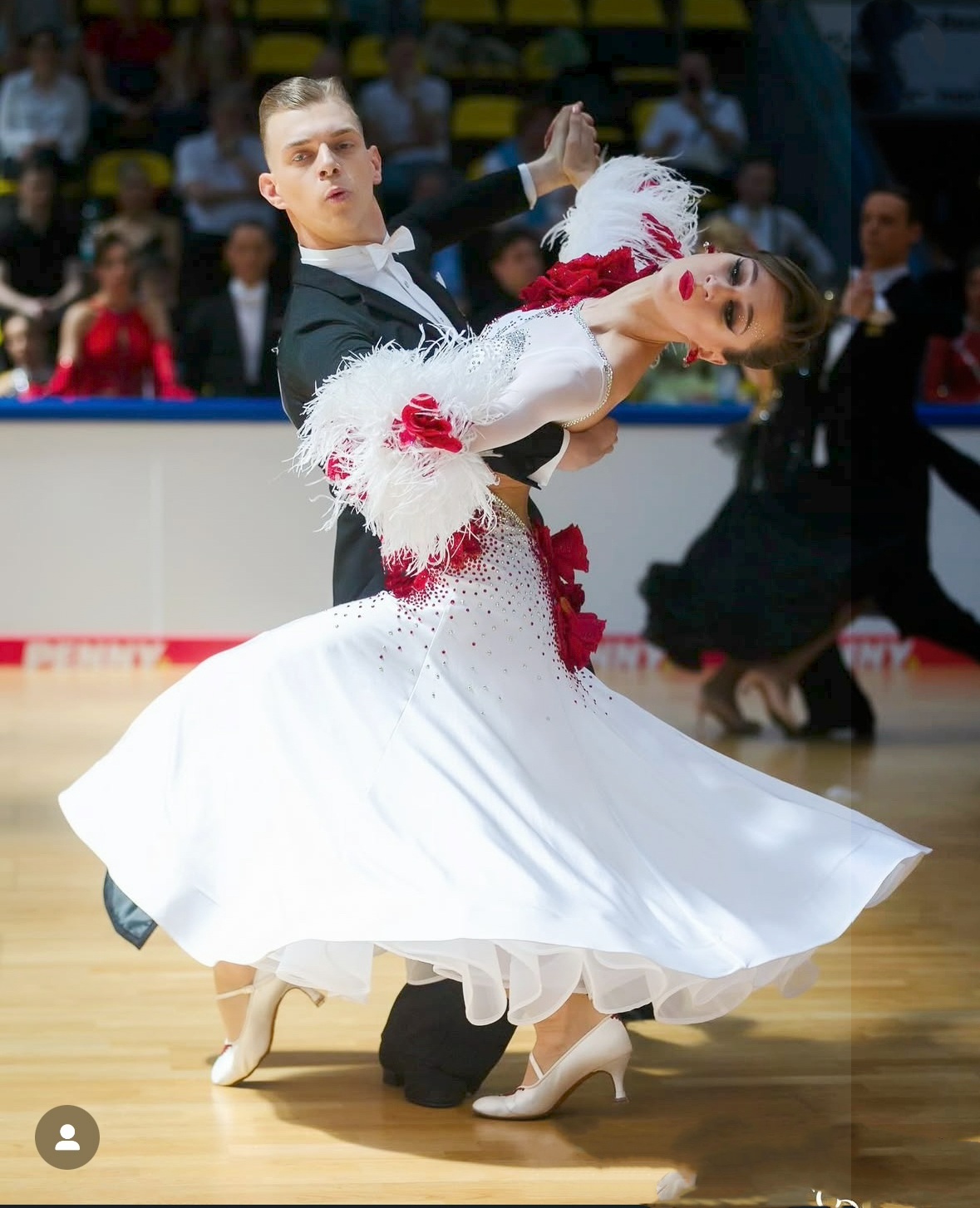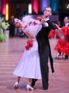 イタリアのラグジュアリーダンスドレスブランドで、世界ファイナリストや長年世界チャンピオンだったロシアのオルガ・クリコワ選手など多くのトップ選手のドレスを制作している「RSアトリエ」がドイツのファイナリスト、セリーヌ・セイディアイ選手のために制作した、赤と白のコントラストが大変美しい長袖のスタンダードドレスです。