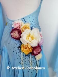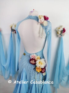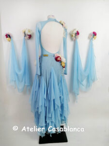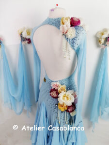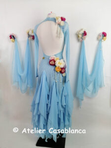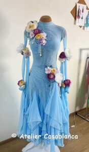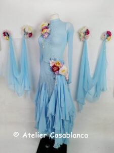 SK-HBE8 プロフェッショナル欧州選手権銅メダリスト着用の立体的なお花のデザインが超美しい、超スタイル良く見える水色の長袖のスタンダードドレス(9号)