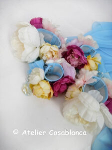 立体的な美しいお花の装飾、垂れ下がるパール、ブルーの美しい石の装飾などすべてが非常にスタイリッシュかつ、エリーナ選手らしい上品なスタイル。お花が美しいバングルで肘の部分と袖口の部分で固定する大き目のジョーゼットのフロートが大変良く踊ります。ボディ部分は水色のメッシュ素材を2枚重ねており、透けないようになっています。ヒップラインは下にベージュメッシュを重ねているので、ショーツのラインなどが見える事がないようになっており、とにかくスタイル良く見えて大変美しく踊ります。