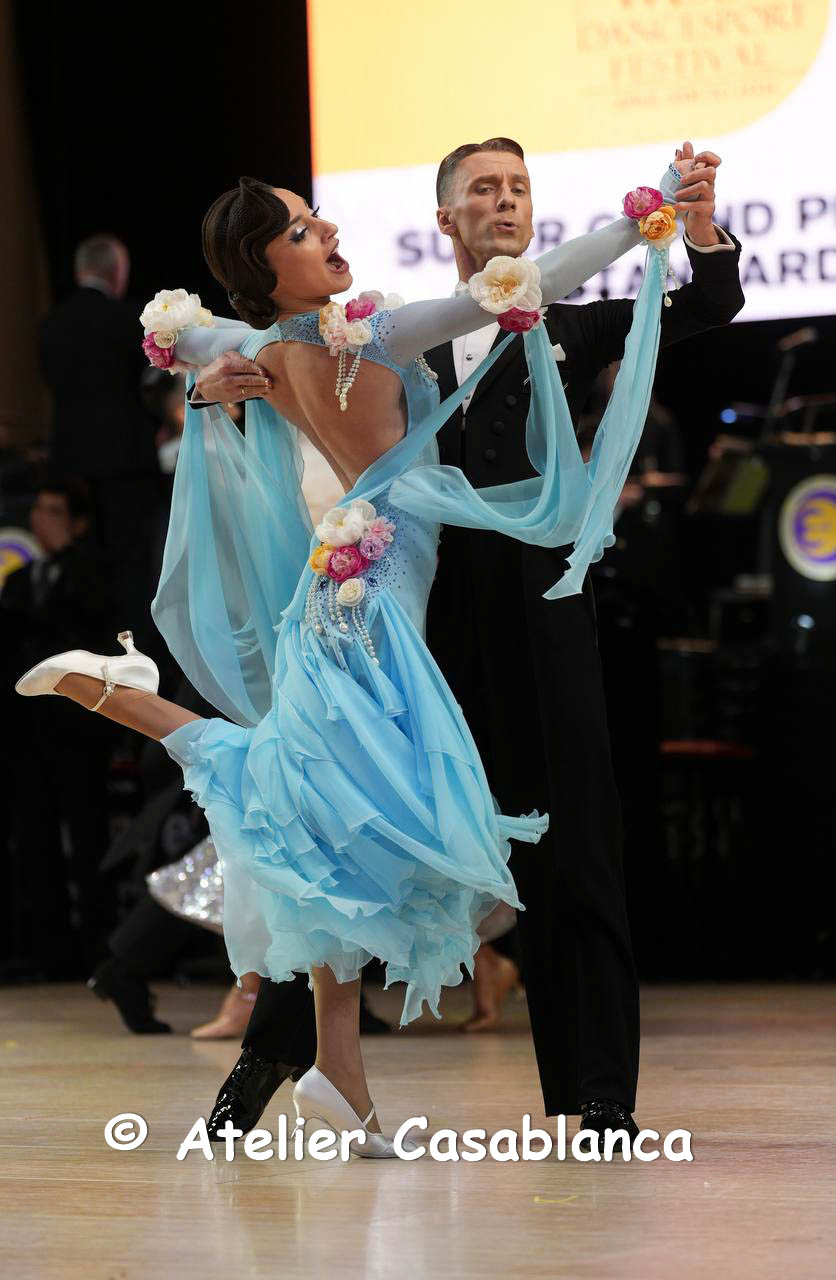 2025年プロフェッショナル欧州選手権銅メダリスト、夏にドイツで開催される世界最大の競技会であるジャーマンオープンのプロフェッショナル部門でもファイナルに輝いた超素晴らしいスタンダードダンサー、エリーナ・ココトワ選手のためにロシアのフィネッリ・クチュールが制作した、超スタイル良く見え、大変エレガントで新スタイルのスカートがスタイリッシュでカッコいい水色の長袖のスタンダードドレスです。日本にいったん売却された再リサイクルドレスで、日本ではデモで1回だけ着用されたのでほぼ新品です。