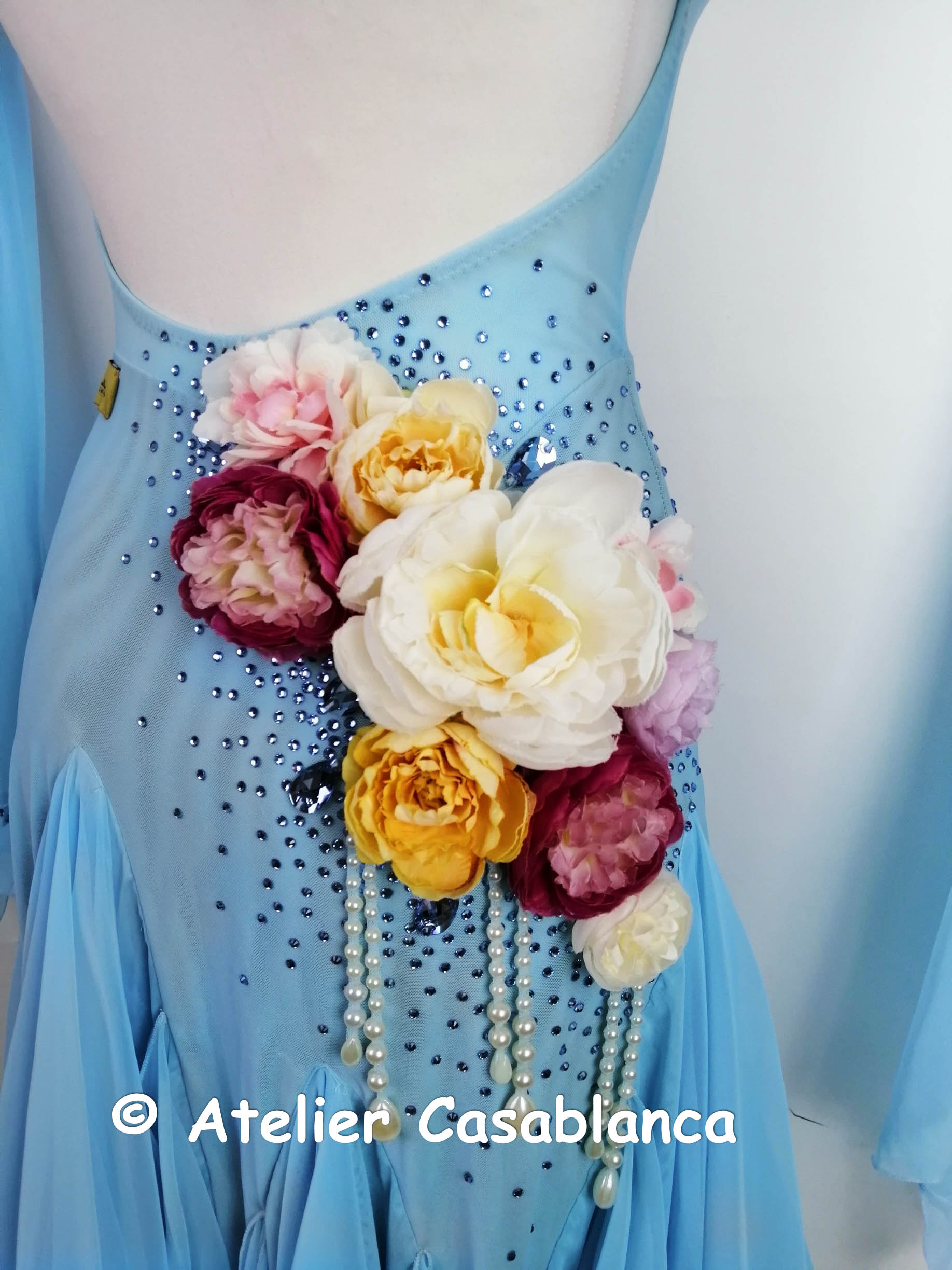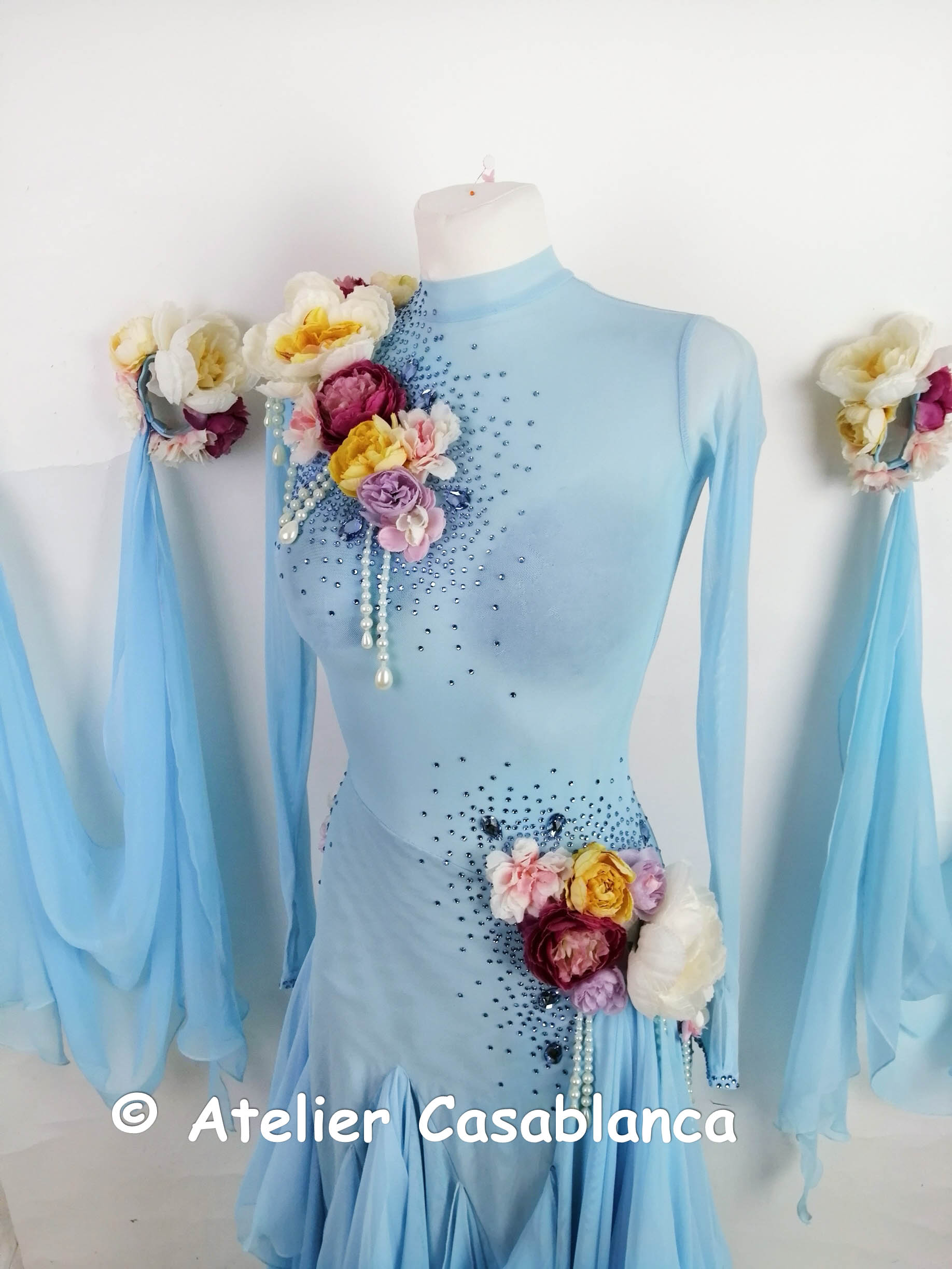 SK-HBE8 プロフェッショナル欧州選手権銅メダリスト着用の立体的なお花のデザインが超美しい、超スタイル良く見える水色の長袖のスタンダードドレス(9号)