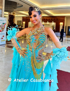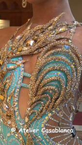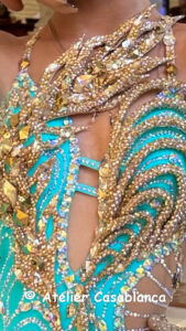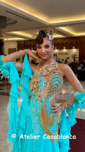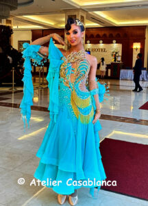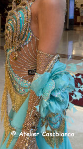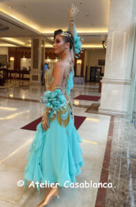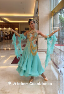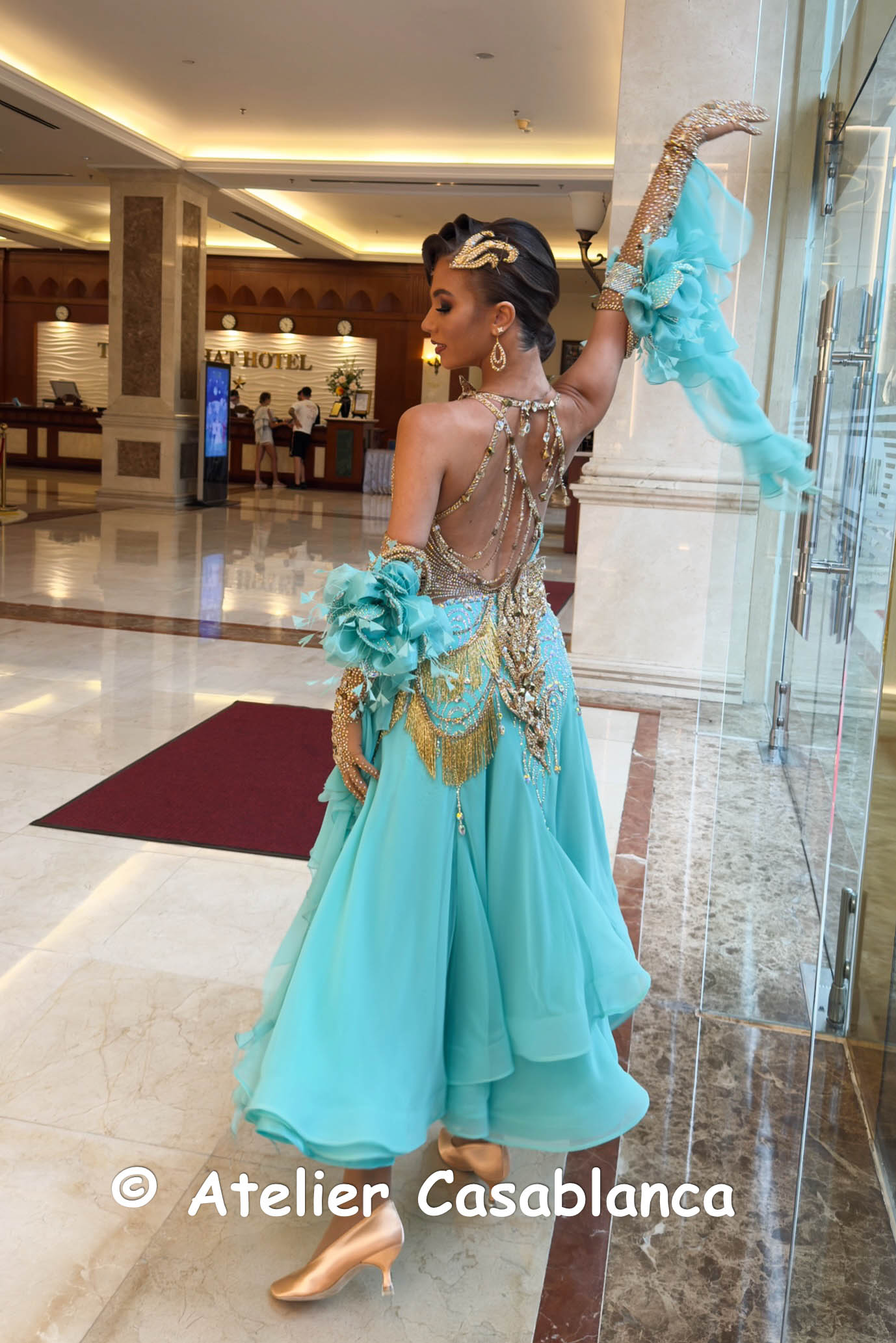 世界最高クラスのロシアのトップラグジュアリーダンスドレスブランド、ARTIがイスラエルのチャンピオンで世界セミファイナリストのタイトルを持つ、ダンス界の多くがWDSFのアマチュアで世界最高のカップルといわれているエレオノーラ・メテリッツァ&ウラディスラフ・コジェフニコフ組のために制作したティファニー色にゴールドを組み合わせた最高に豪華なスタンダードドレスです。
