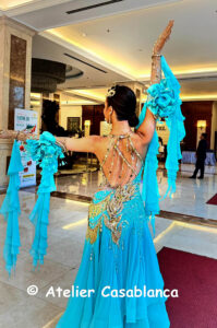 ベージュメッシュに石をびっしりと貼ったグローブは今人気の指がついているデザインで、立体的なお花の飾りに羽を組み合わせており、美しいジョーゼットのフリルのフロートが垂れ下がって大変よく踊ります。
