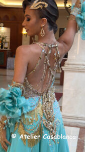 ノースリーブですがベージュメッシュを組み合わせており、背中もデコルテもあまり開きすぎないデザイン委なっており、流れるような立体的なゴールドのオーナメントの装飾、ARTIらしい超豪華な美しいオーナメントのデザインやバックスタイルの竹ビーズ使いなどが超豪華な最高にゴージャスなドレスです。