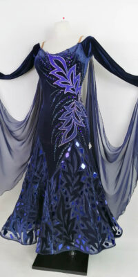 ボディはベージュのストレッチライクラ素材に赤のストレッチベルベットを使って美しいアシンメトリーなラインが描かれており、ウェストが細く超須あちる良く見える大変素晴らしいデザイン。ベージュ部分にはオーロラのスワロフスキの石がびっしりと貼られており、非常に豪華に美しく輝きます。デコルテラインの立体的なプリーツ加工されたダブルのフリルと美しいゴールドの立体的なお花のオーナメントが大変華やかで美しく、胸元が開きすぎない上品なデザイン。背中もあまり大きく開かず、また二の腕がうまく隠れてしまうお花のオーナメントがついた美しいロンググローブが付属しているので、ドレスの露出度は低めでタンニングなしでも全く問題ありません。右の肩から垂れ下がるジョーゼットのフロートが動きを出します。