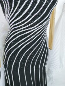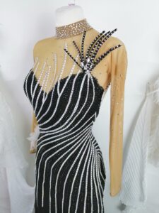 スタンドカラーで肩や背中の露出がほぼないエレガントな印象のドレスで、デコルテラインの切り替えのラインが非常に美しく、ブラックのボディ部分に装飾された白の流れるようなオーナメントのラインがウェストを細くスタイルよく見せる、大変斬新でかっこいい、絶対に目が離せないデザインのドレスです。