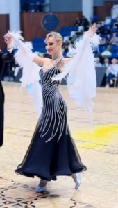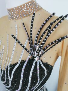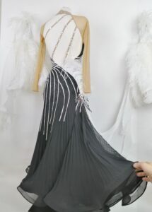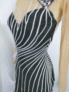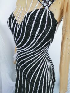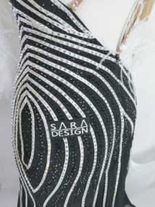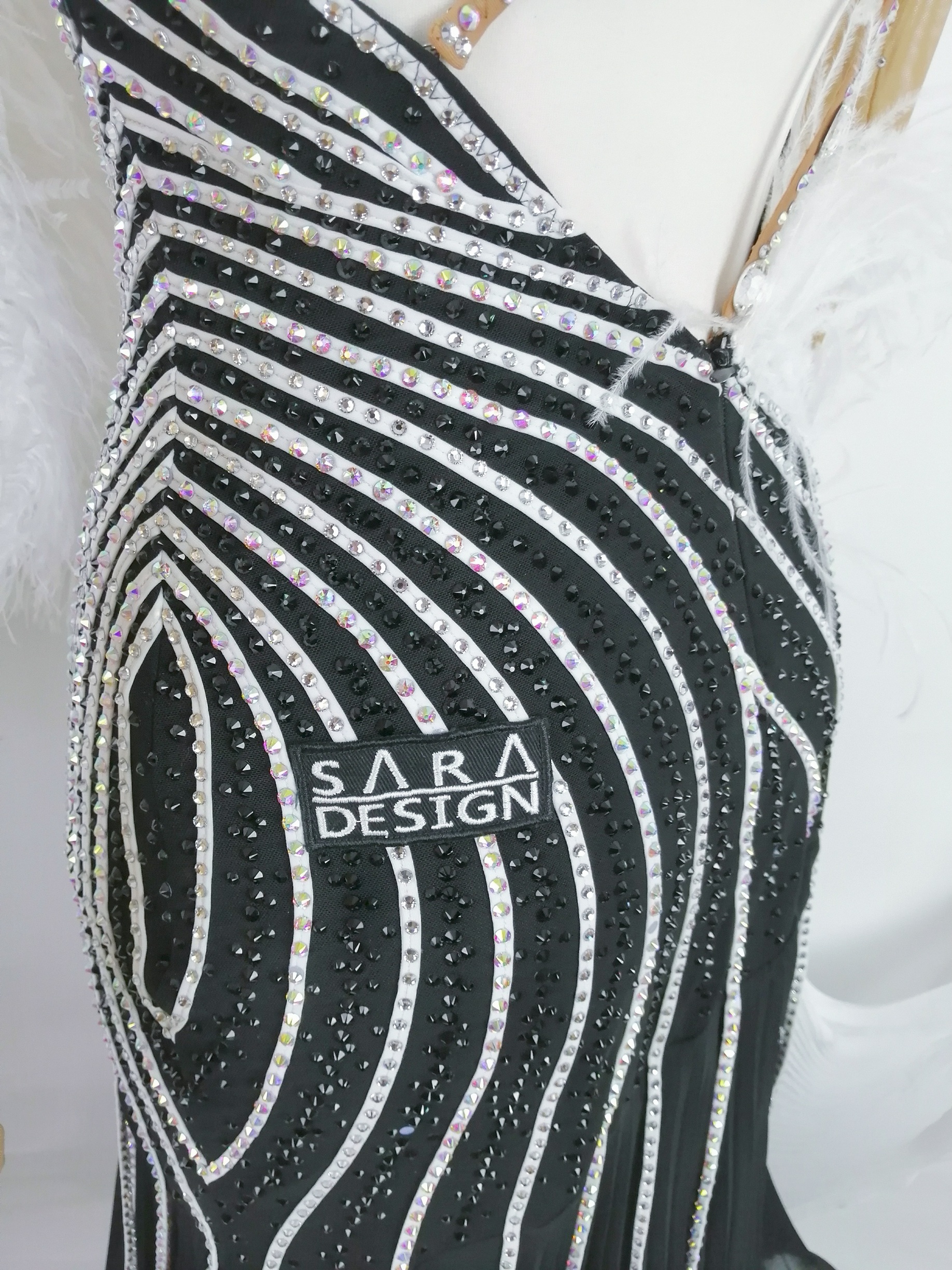 ルーマニアのトップ選手で、グランドスラムなどのビッグコンペでのトップランキング常連の超素晴らしいスタンダードダンサー、オアナ・アヴラム選手のためにスロバキアの超素晴らしいダンスドレスブランド、「サラ・デザイン」が制作したブラック&ホワイトのスタンダードドレスです。スポンサードレスとして制作され、2試合のみで着用されたほぼ新品。