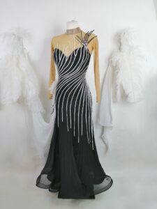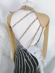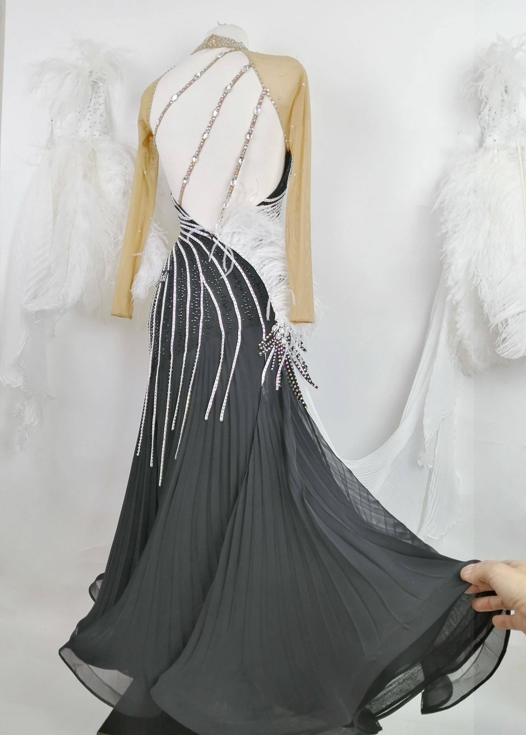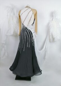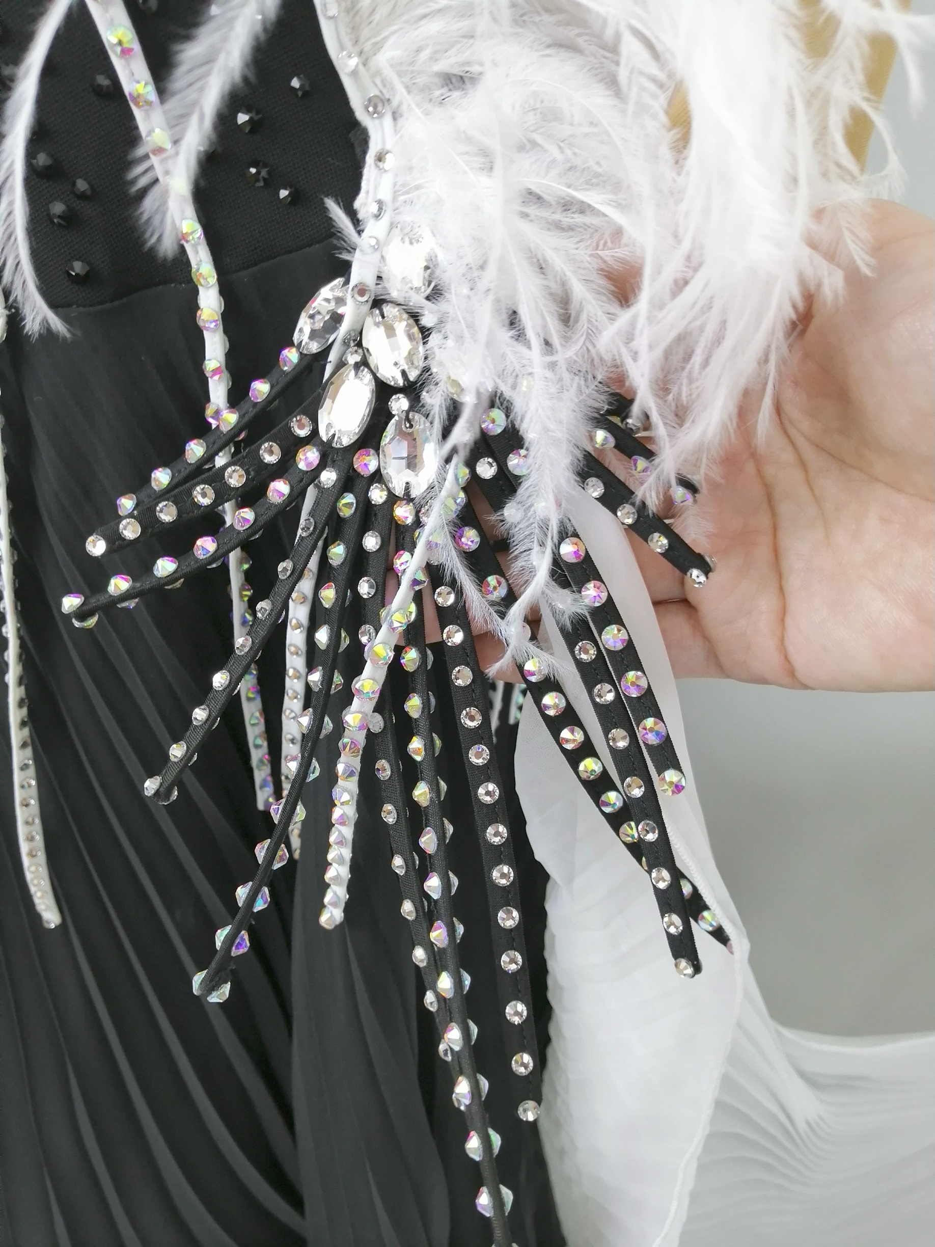 SK-IBE18ルーマニアのトップ選手のために「サラ・デザイン」が制作した、オーストリッチの羽の存在感が豪華なブラック&ホワイトのスタンダードドレス(9号)
