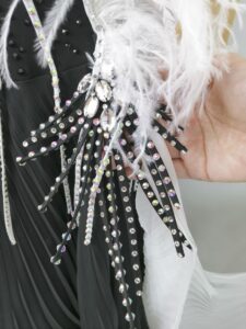 白のライン状にはオーロラの石がびっしりと貼られており、黒のボディ部分にはすべて黒の石が貼られています。胸元や腰の立ち上がるようなオーナメントのデザインが大変スタイリッシュで今風で、オーストリッチの羽づかいも大変印象的です。