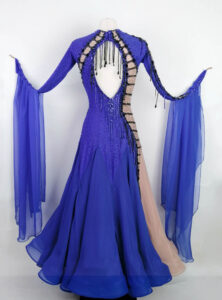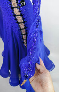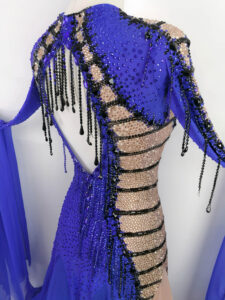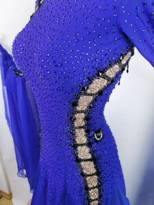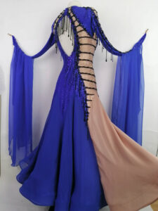 スカートはヴィンテージローズ色のパニエのアンダースカートを2枚重ねており、裾にはホースヘアの縁取りがあります。外側のスカートはロイヤルブルーのジョーゼットで、右サイドの切り替えた部分はすべてヴィンテージローズ色になっています。使われている石の色はコバルト、ジェット、オーロラ、ヴィンテージローズで、プレチオサを使用しているので輝きがとても強くて大変品質が高いドレスです。