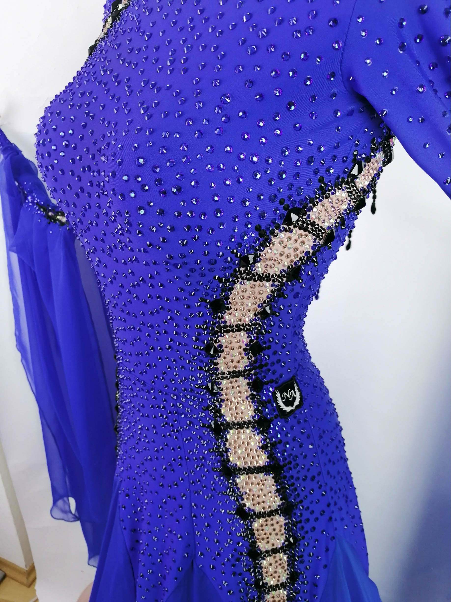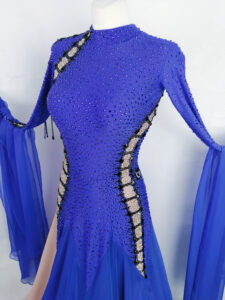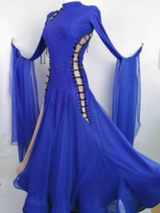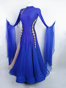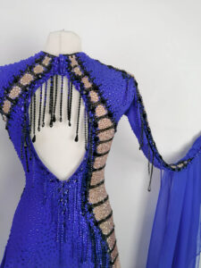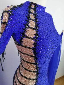 ロシアの大変すばらしいダンスドレスブランド、「ナタリー・アート」がロシアのトップ選手、アンナ・トレンゼレワ選手のために制作した、全身石びっしりの超豪華でめちゃくちゃスタイルよく見えるロイヤルブルー&ヴィンテージローズ色の長袖のスタンダードドレスです。