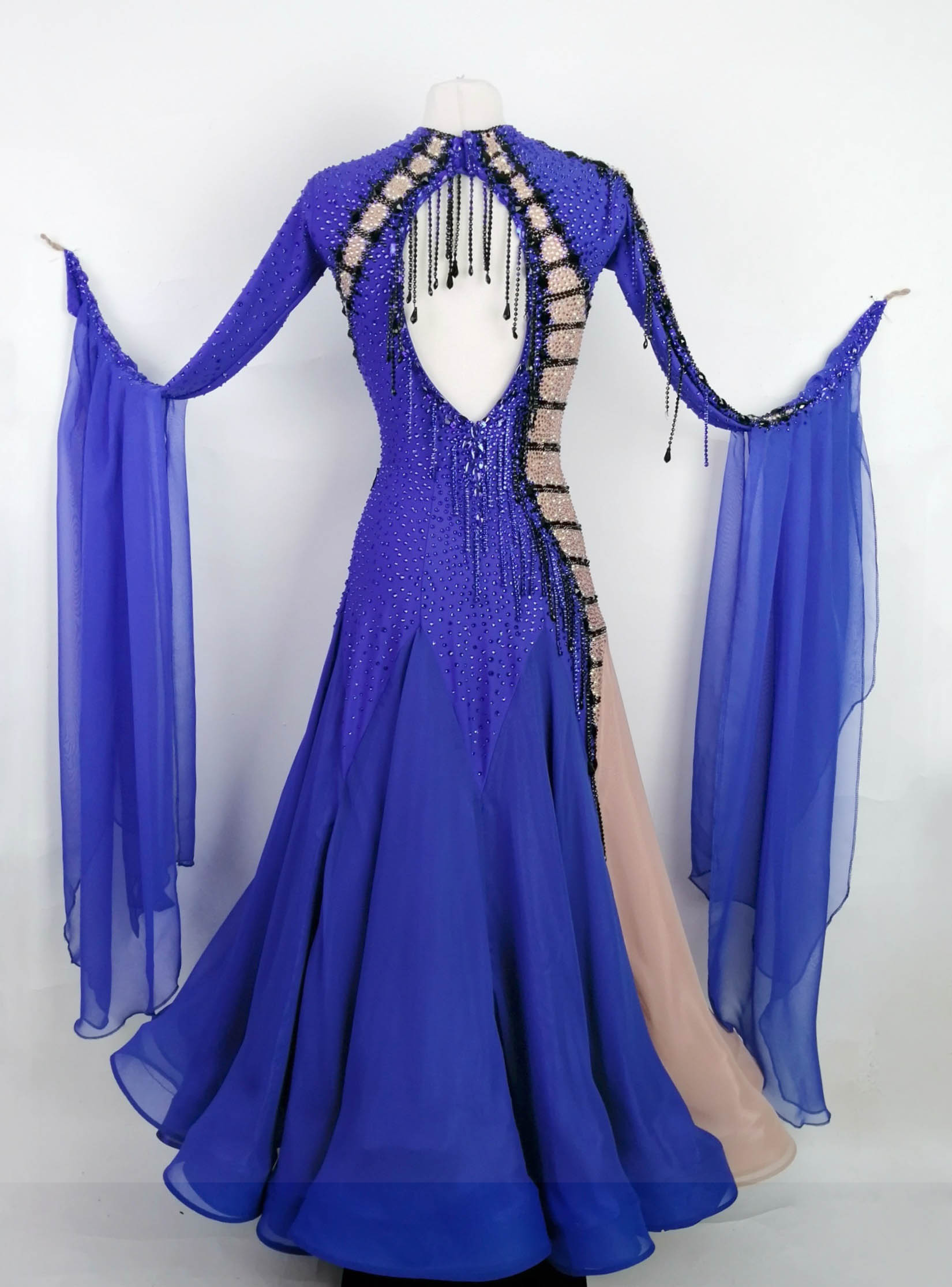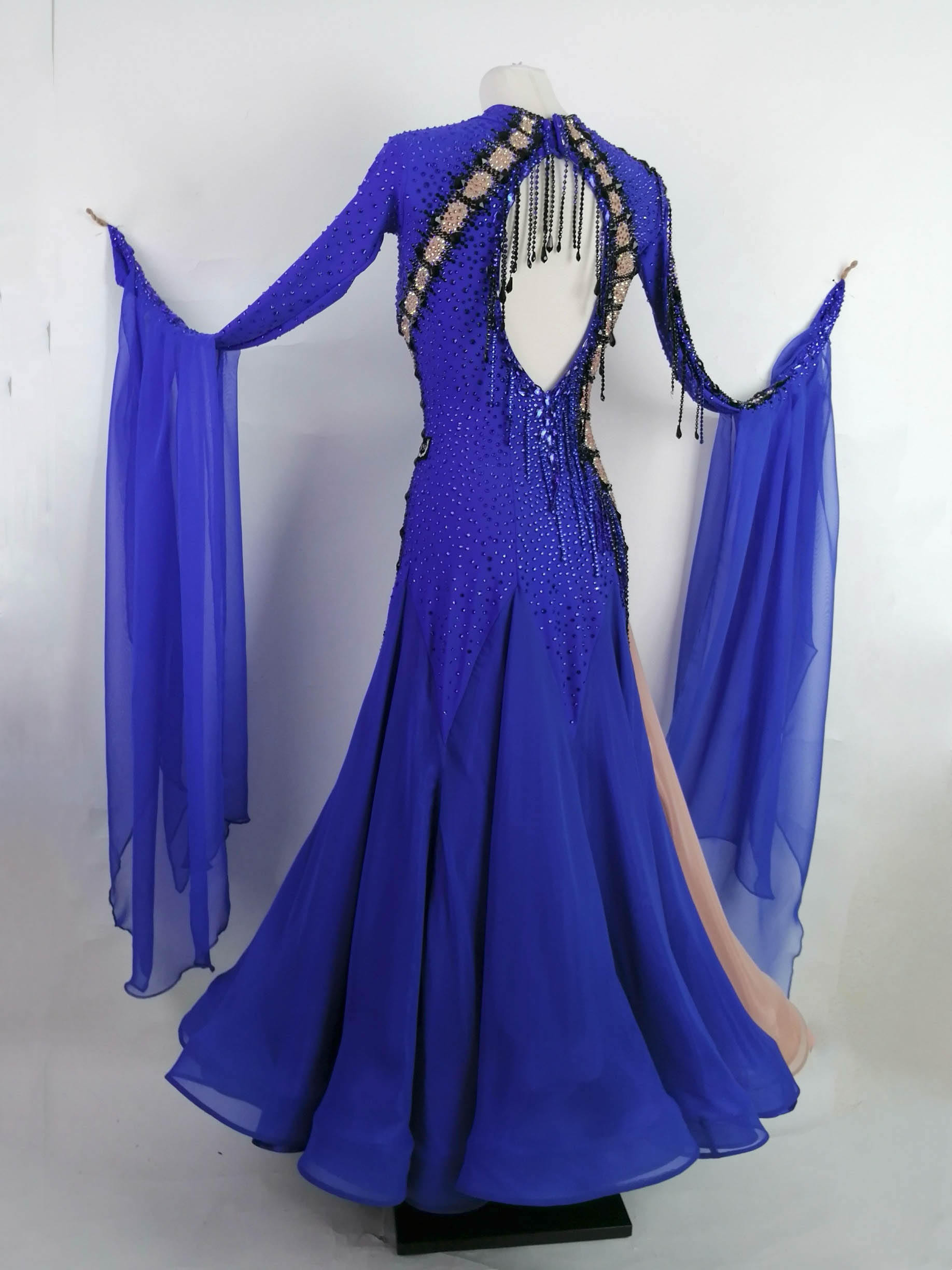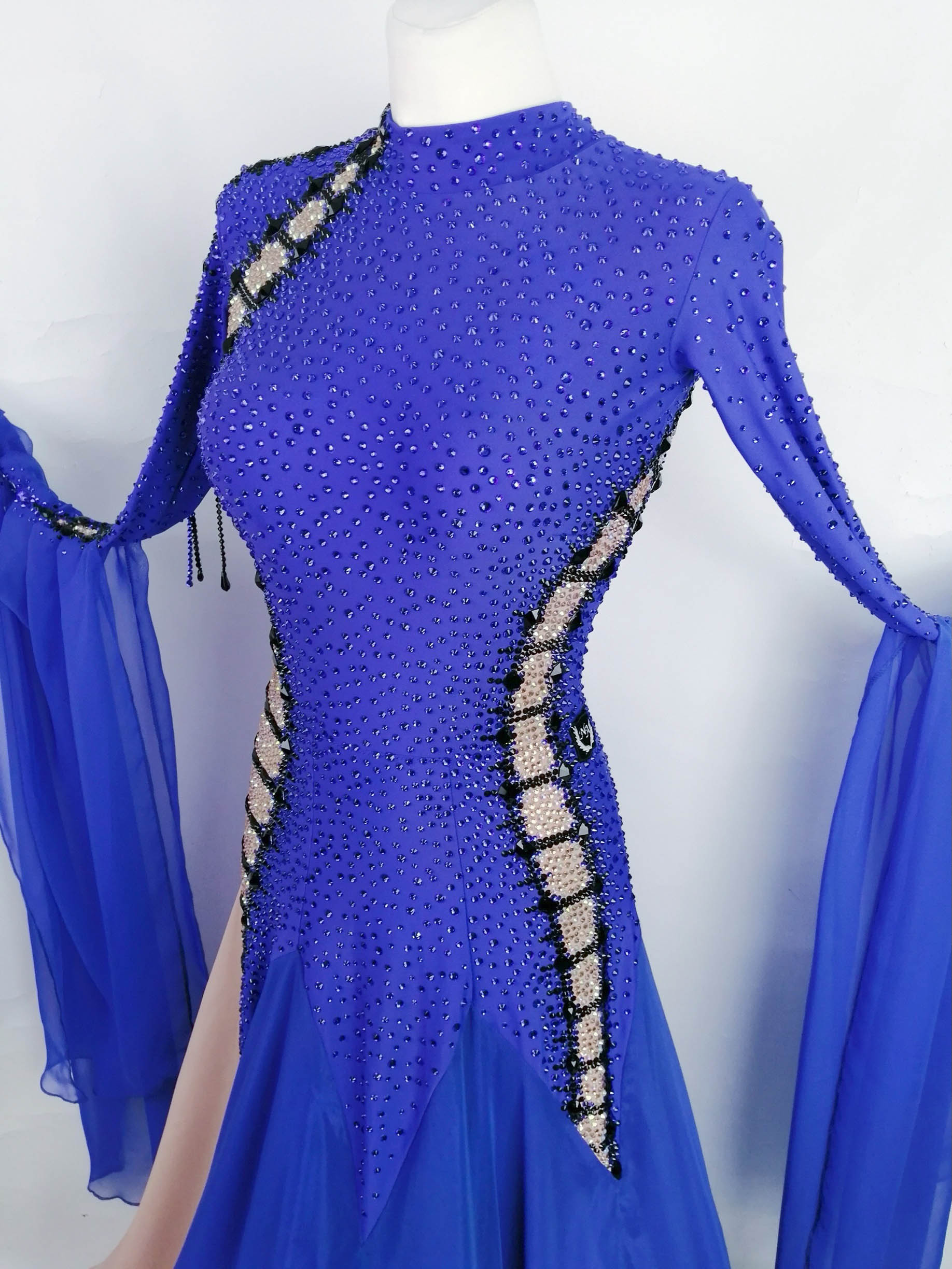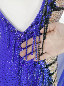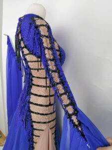 袖にも同じ切り替えと黒のラインが入っており、どの角度から見ても非常に目立つ超美しいデザインのドレスです。背中と袖に垂れ下がる黒の石びっしりのチェーンも大変印象的です。スカート以外はすべて隙間なくびっしりと石が貼られており、ボディ全体もブルーの石でびっしりで、非常に豪華で存在感があります。