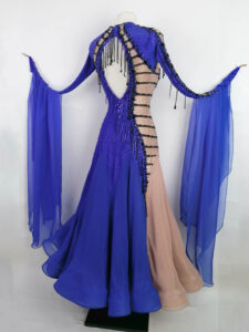 イギリス製の布を使って制作しており、縫製も非常に丁寧で最高級クラスの品質のドレスです。フロートはドレープを寄せた大きなデザインで、WDC系の大きなフロートが主流のコンペように制作されており、スカートとフロートがダイナミックに踊ります。