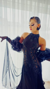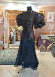 黒のグローブにボリュームたっぷりのオーガンジーの立体的な飾りがついたデザインが非常に美しく、ホールドしたラインを大変美しく見せます。大きなジョーゼットのフロートがドレスから右腕につながるデザインで、大変美しく踊ります。