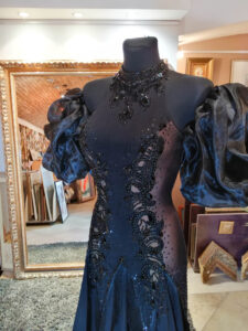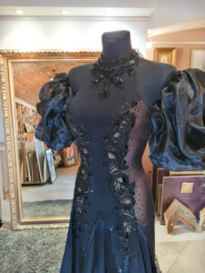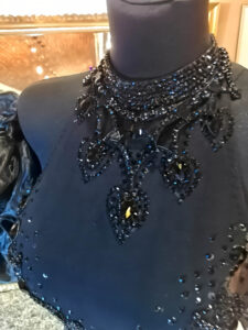 縦のラインを出すように美しい黒のレースモチーフの装飾があり、ホルターネックでネックラインの石の装飾が大変豪華で美しいデザインになっています。写真ではわかりづらいですが、スカートの切替の部分にフリンジが装飾されていて動きを出すデザインです。