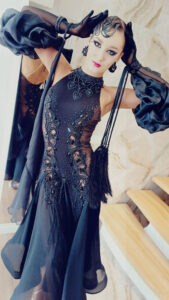 ラトビアの世界選手権代表選手であるヴィクトリア・スモリナ選手のためにラトビアの大変すばらしいダンスドレスデザイナー、「ガリーナ・ペトルナ」が制作したエレガントで美しい黒のホルターネックのスタンダードドレスです。