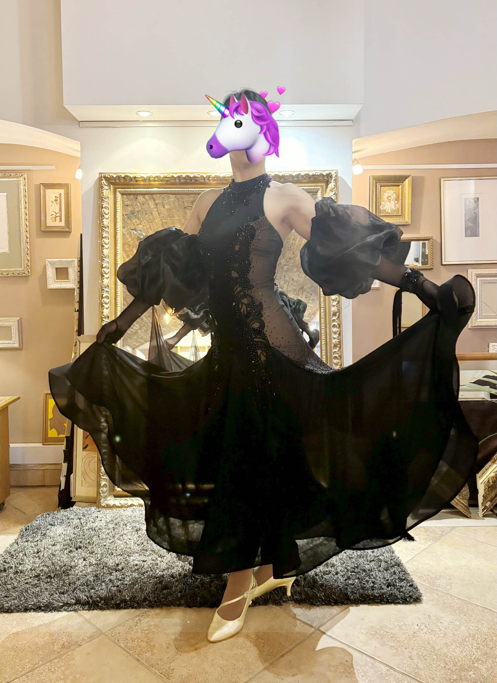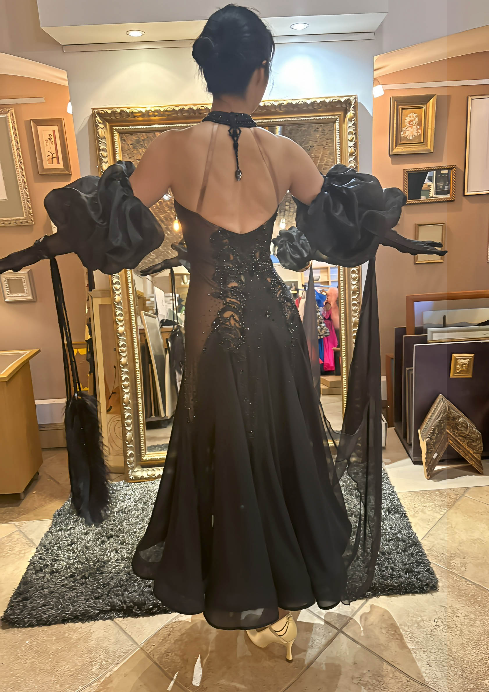 黒のグローブにボリュームたっぷりのオーガンジーの立体的な飾りがついたデザインが非常に美しく、ホールドしたラインを大変美しく見せます。大きなジョーゼットのフロートがドレスから右腕につながるデザインで、大変美しく踊ります。